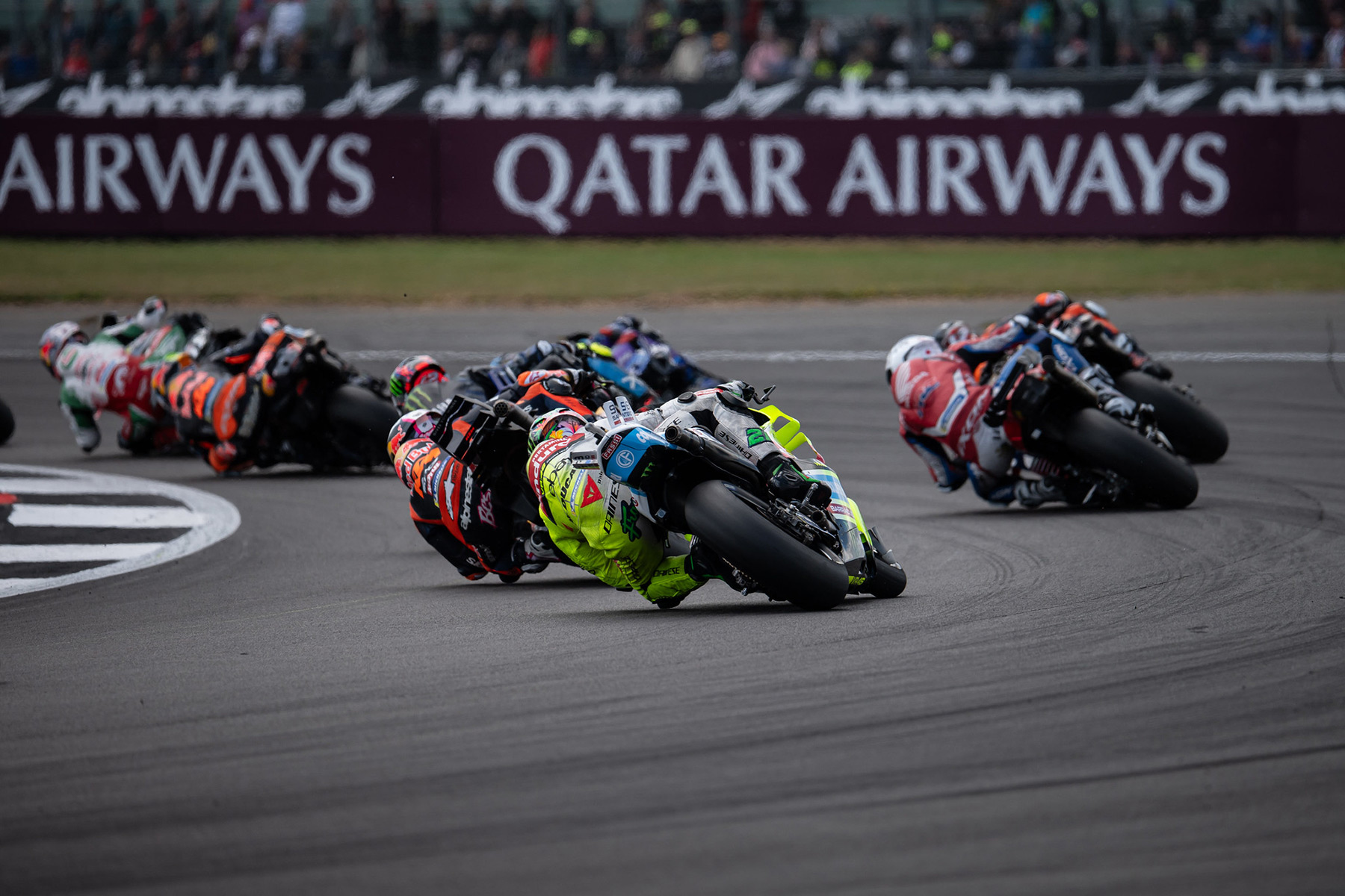 Morbidelli, que tenía una sanción de tres puestos en parrilla por rodar lento en mitad de la trazada en entrenamientos, estaba rodando muy atrás en la primera vuelta. Entró colado en la chicane de las curvas 16 y 17, con la mala suerte de que Espargaró se cayó justo en ese punto y su moto acabó derribando al italiano, que además se lesionó un pie. La Ducati GP24 de Morbidelli quedó en mitad de la pista soltando aceite, motivo por el que se detuvo la carrera.