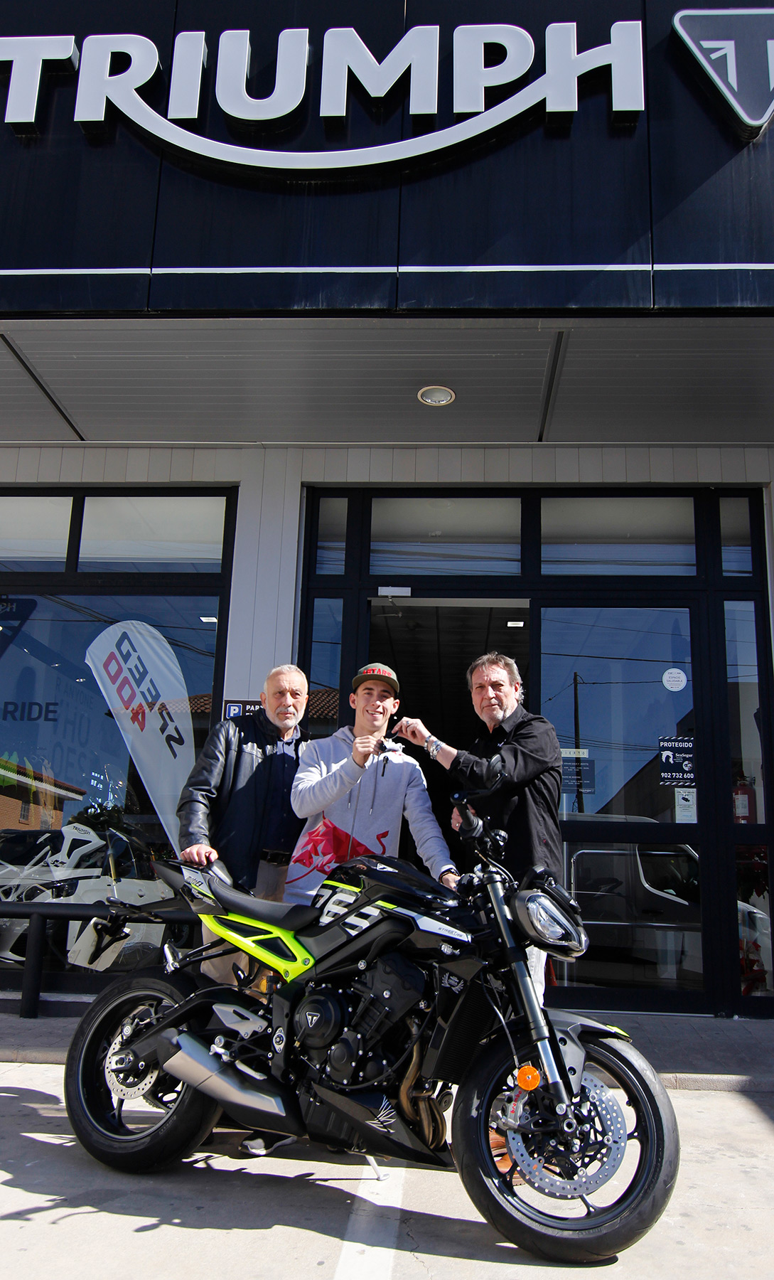Esta Triumph Street Triple 765 RS ha sido entregada a Pedro Acosta en el concesionario oficial de su tierra natal "Steel British", Murcia, donde ha querido aprovechar para resaltar «Es un enorme premio a un esfuerzo increíble».