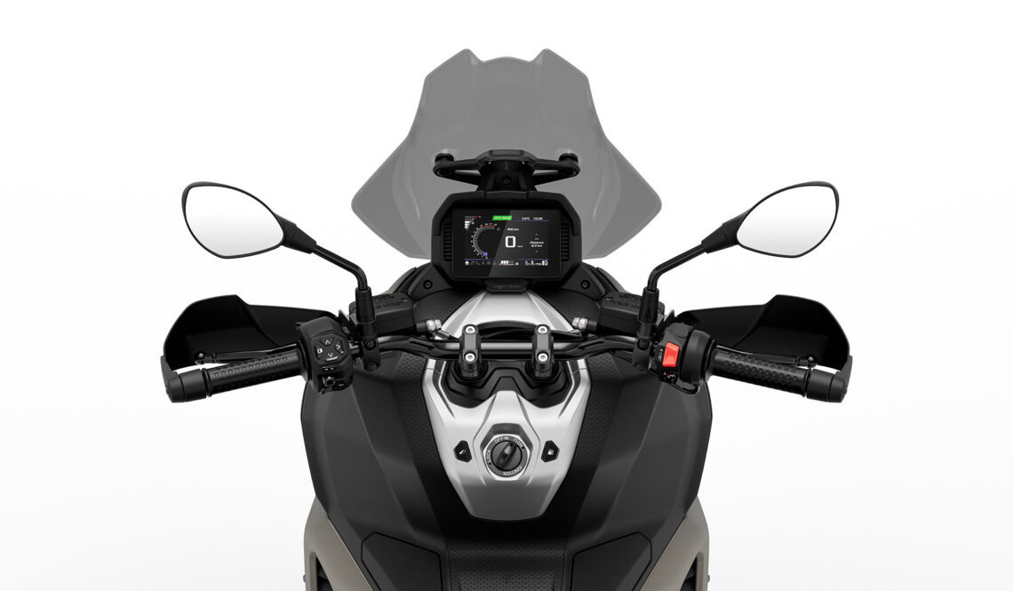 Equipada con un completo paquete tecnológico, incluye pantalla TFT de 5", llave inteligente, control de tracción y ABS desconectable. Bajo el asiento hay espacio para un casco integral, y la pantalla frontal ajustable en cinco alturas refuerza su vocación viajera.