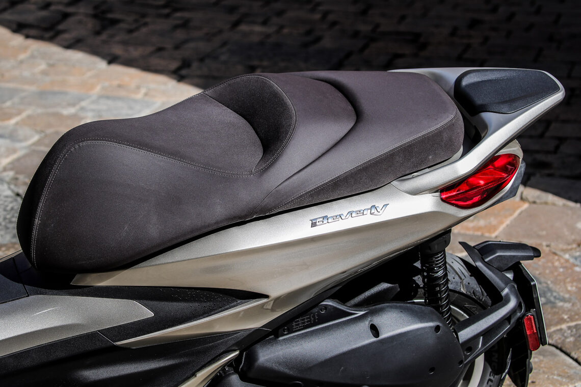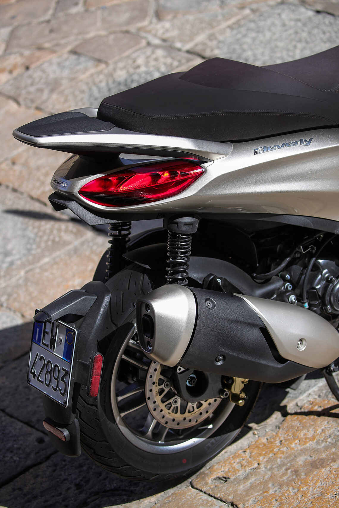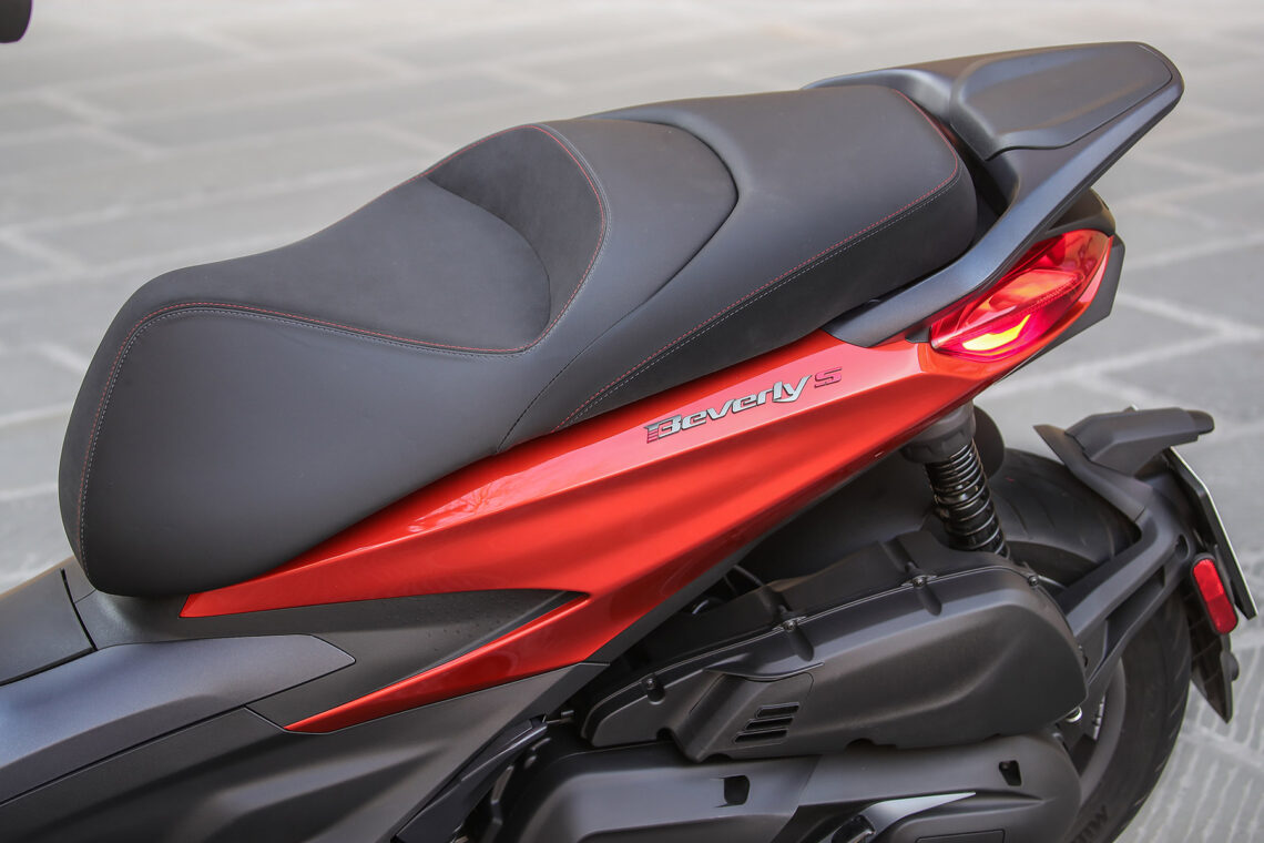 En cuanto al diseño, del mismo modo que sucede con el Beverly 300, encontramos una carrocería totalmente nueva. En este caso sí ofrece un nuevo diseño del chasis (doble cuna de acero tubular), y lo que respecta a la parte ciclo, la misma que la del Beverly 300 recientemente analizada. En cuanto al resto de novedades, son prácticamente las mismas al 300, iluminación full LED, llave keyless, etc. La principal diferencia estética con el 300 reside en su pantalla frontal y en la doble salida de escape
