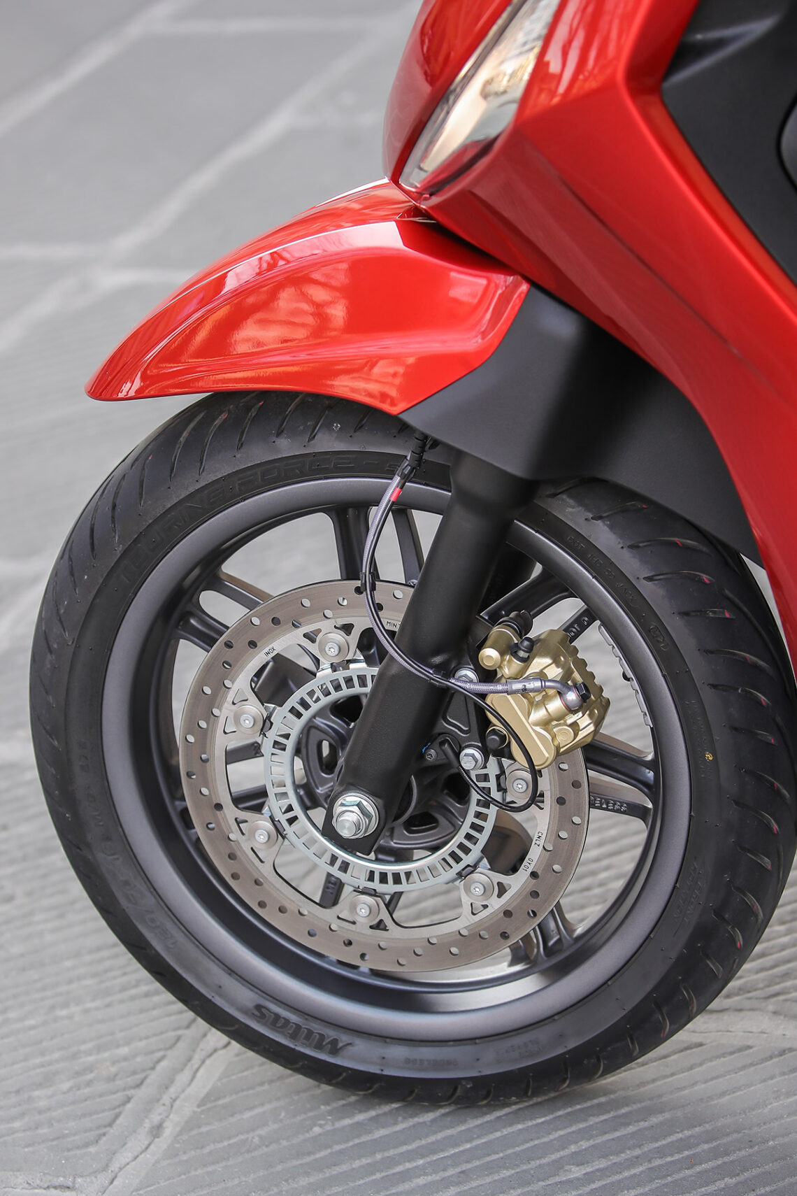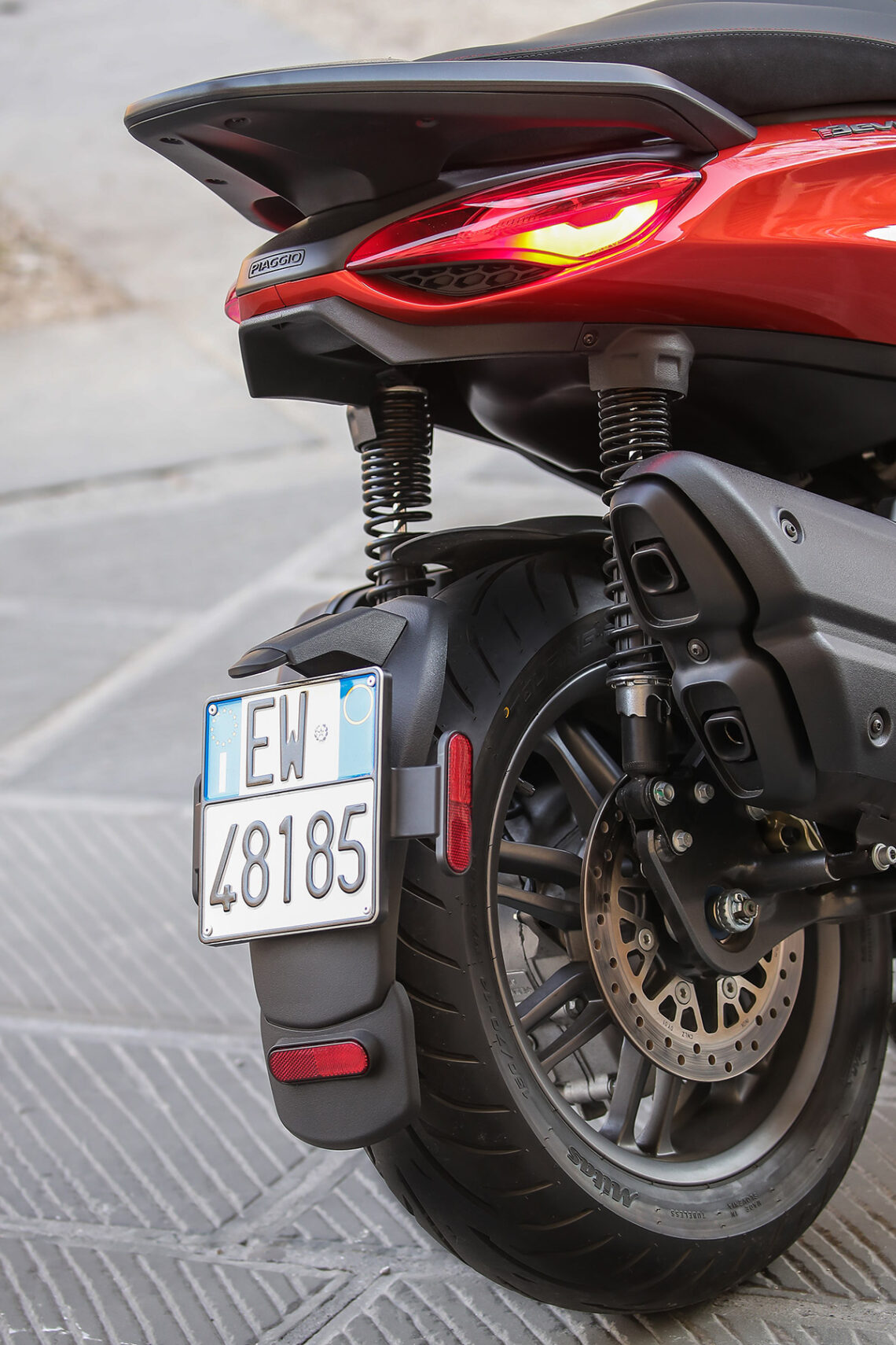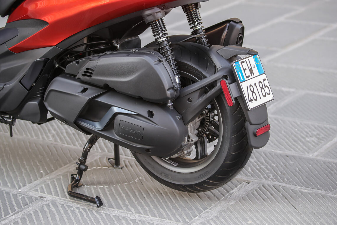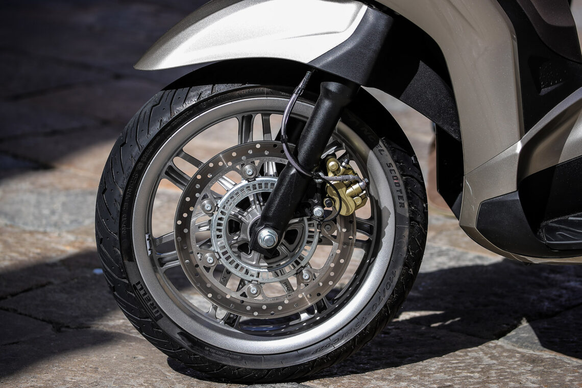 Por último, el Beverly 400 mantiene las llantas de 16" delante y 14" detrás pero aumenta el ancho de la medida de los neumáticos, siendo ahora un 120/70 en lugar de un 11/70 para el tren delantero y un 150/70 en lugar de un 140/70 para el tren trasero.