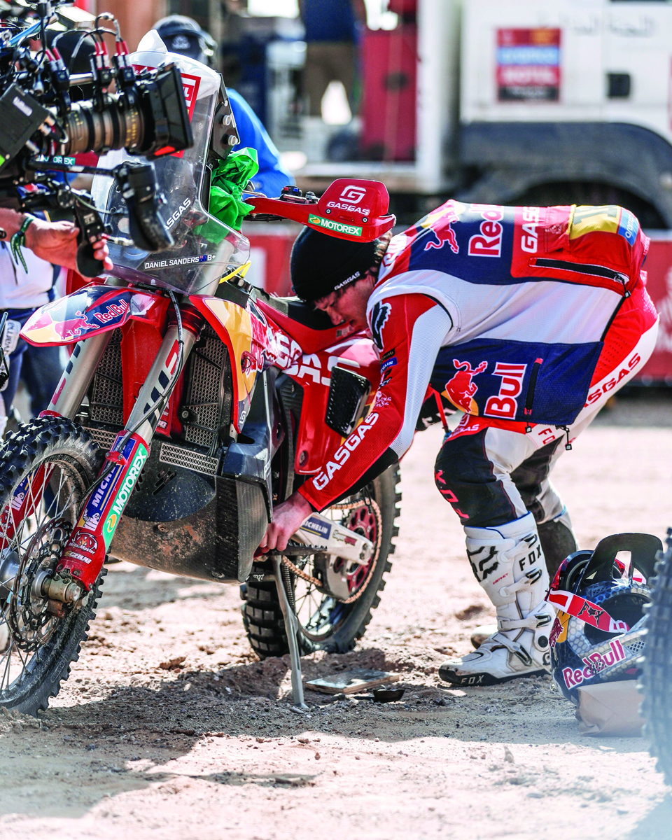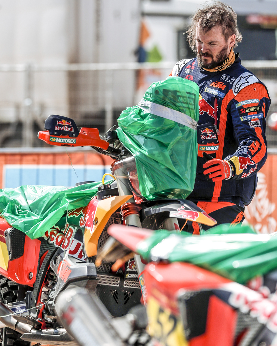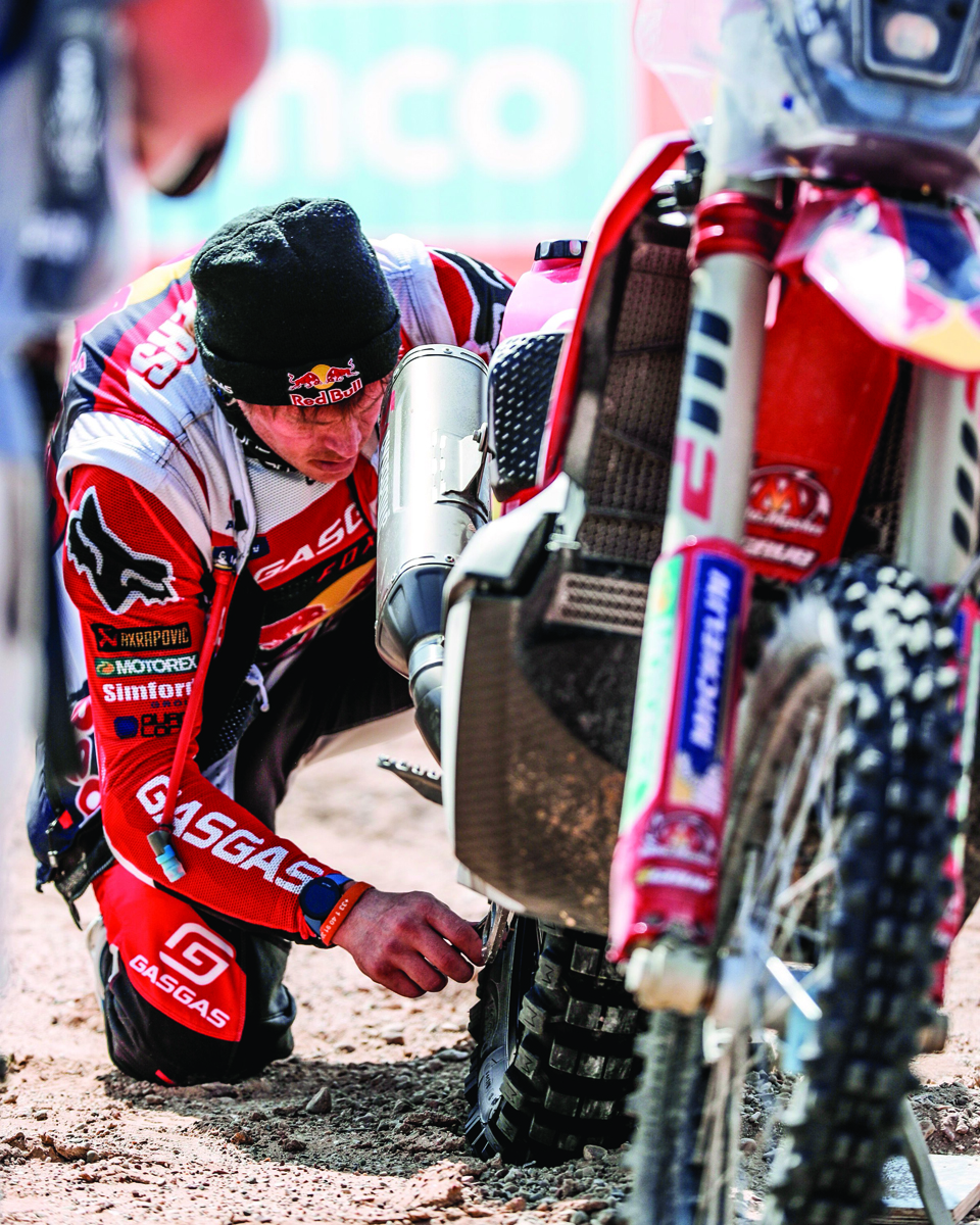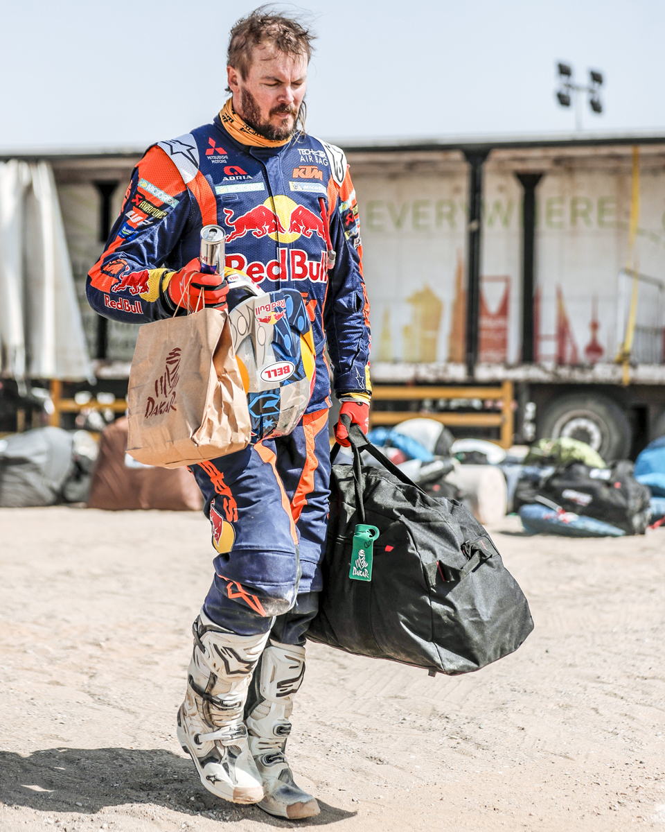 Fue el caso de los pilotos que encabezan la tabla. En Empty Quarter se pudo ver al nuevo líder de la general, Toby Price, agotado tras la etapa, pero con la obligación de reparar su KTM para que al día siguiente esté lista. Lo mismo le ocurrió a otros pilotos punteros como Skyler Howes, Daniel Sanders o Matthias Walkner, entre otros muchos.
