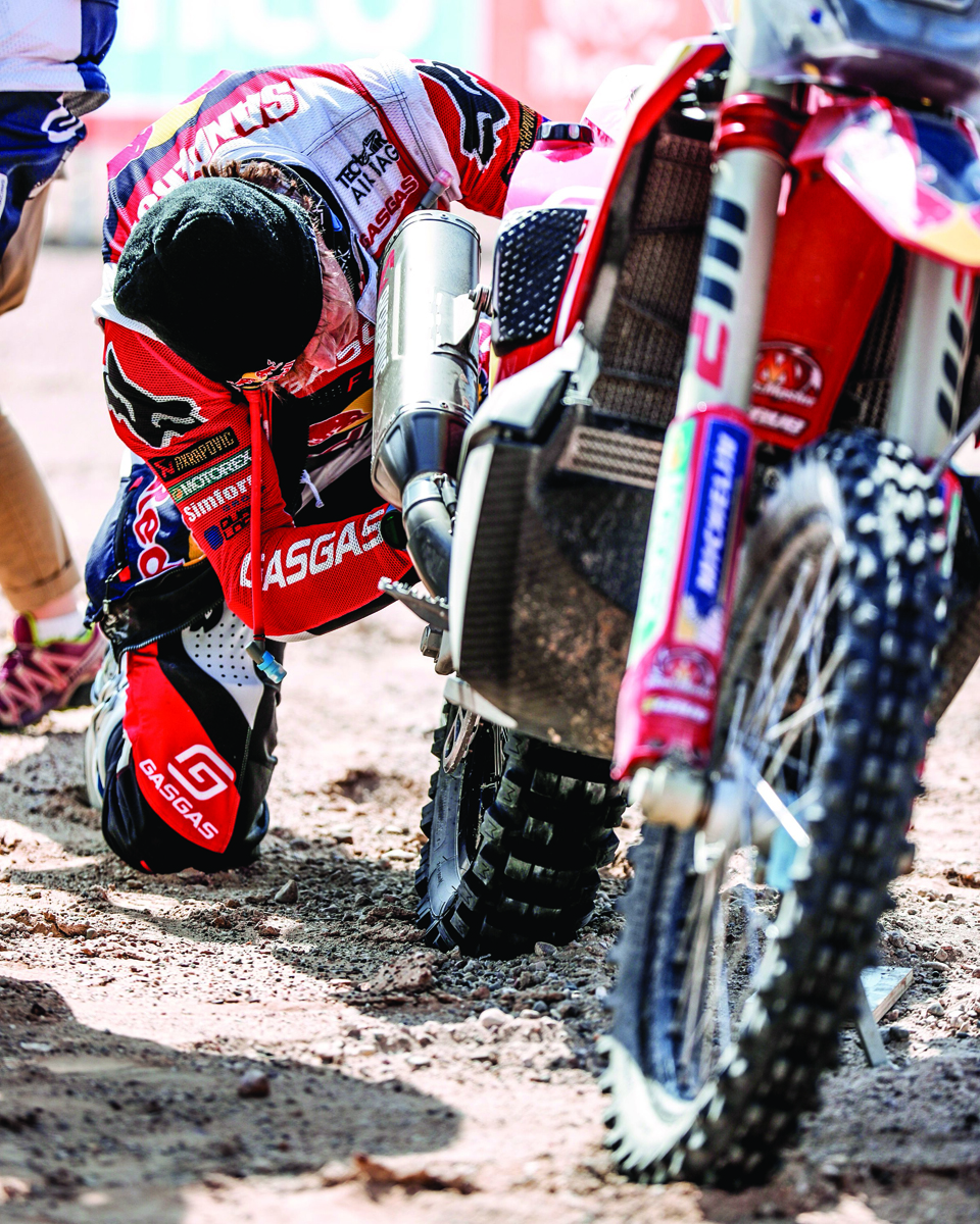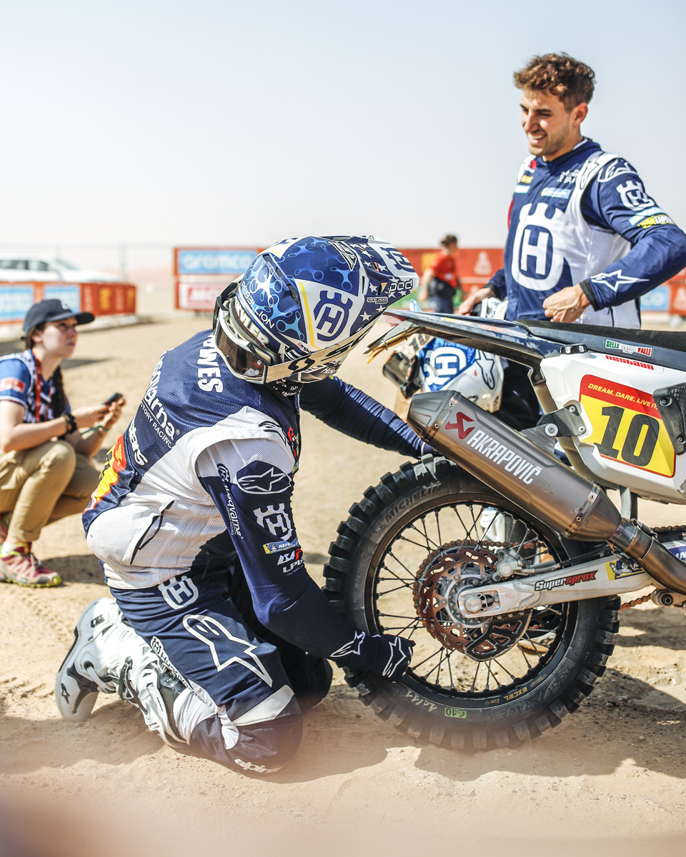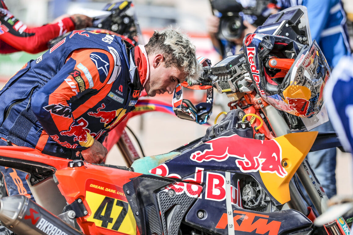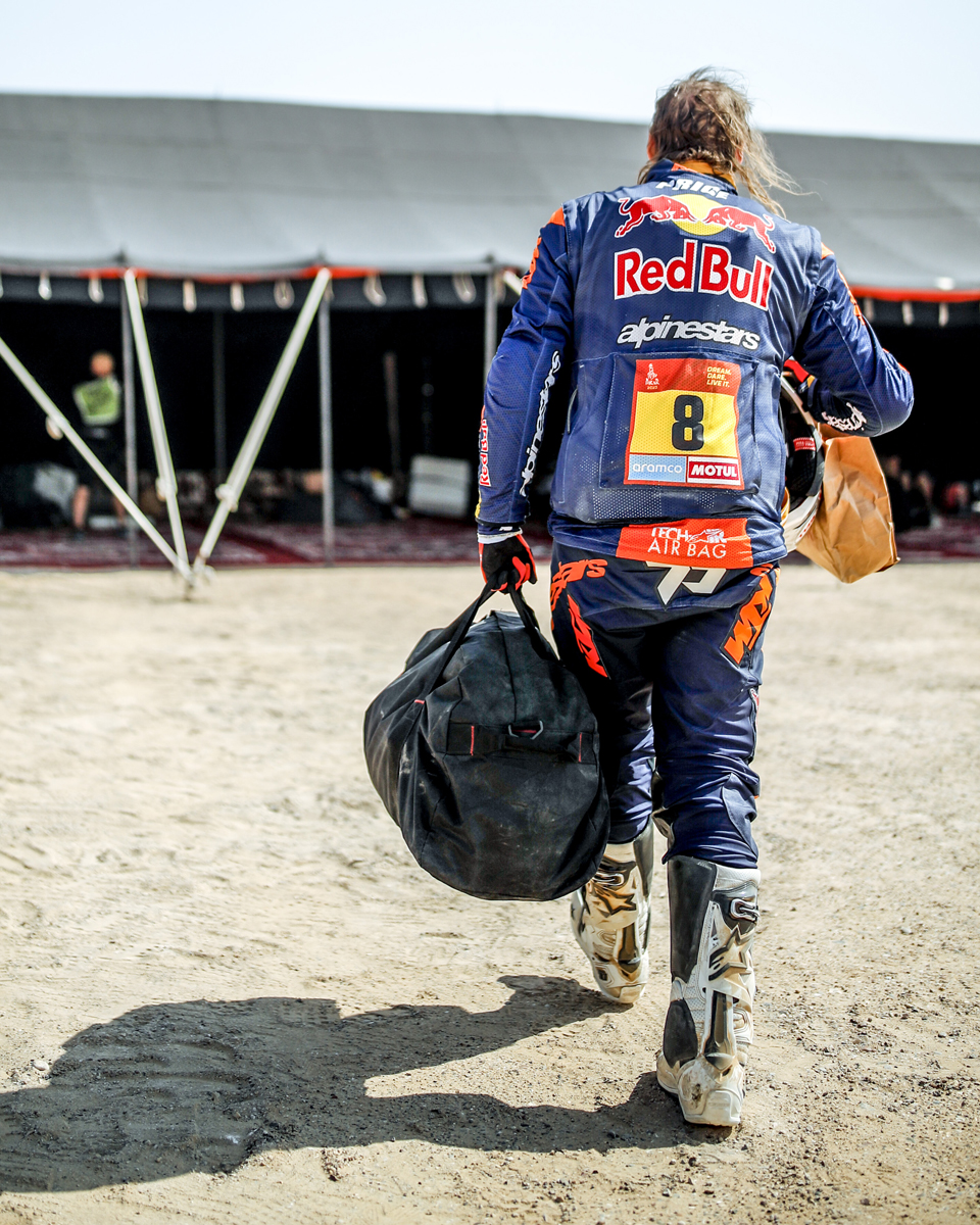 Fue el caso de los pilotos que encabezan la tabla. En Empty Quarter se pudo ver al nuevo líder de la general, Toby Price, agotado tras la etapa, pero con la obligación de reparar su KTM para que al día siguiente esté lista. Lo mismo le ocurrió a otros pilotos punteros como Skyler Howes, Daniel Sanders o Matthias Walkner, entre otros muchos.