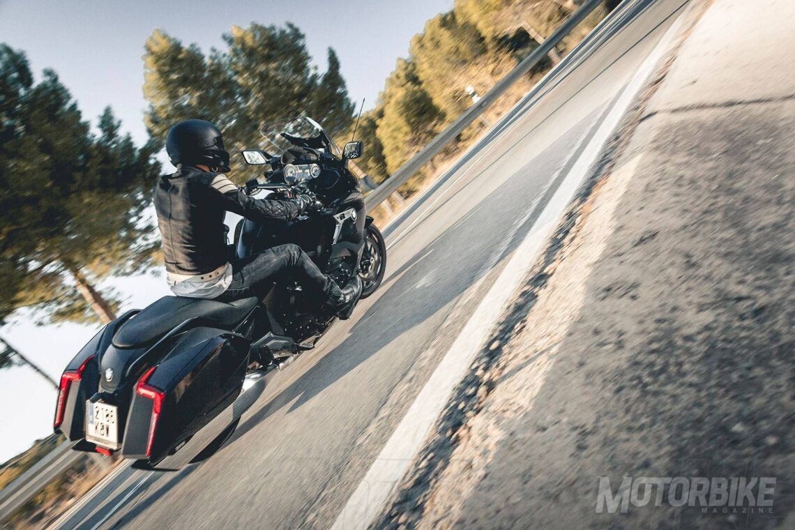 Pero esta moto está diseñada para otro ambiente. Debía ir en busca de carreteras, curvas y autovías. Aquí la moto está en su salsa y es donde demuestra todas sus cualidades. Me puse mi equipación y me fui directo a la sierra. Alguno de mis amigos que vio la moto comentó que si parecía un barco, que menudo trasto… Al final del día cambiaron de opinión. A pesar de ser una moto que no está hecha para inclinar mucho, puesto que los avisadores instalados en las plataformas delanteras rozan con bastante facilidad, el bajo centro de gravedad, el par motor a bajas vueltas, la potencia arriba y las suspensiones electrónicas hacen que sea una moto fácil de llevar y con la que se puede ir a un ritmo relativamente alto sin notar ese esfuerzo extra que exigen algunas motos.