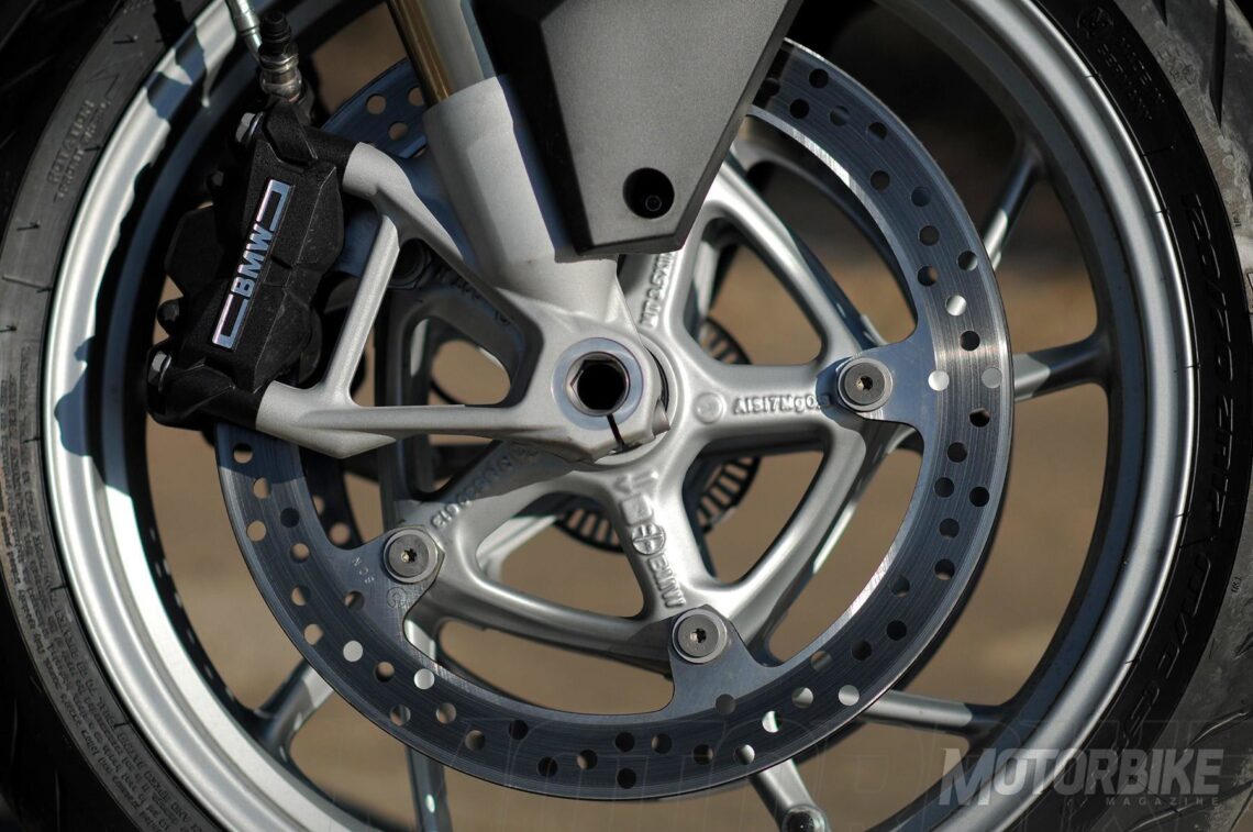 La frenada de la BMW R 1250 RT viene siendo muy similar al modelo anterior, tampoco había queja al respecto. Ofrece una mordida contundente sin fatiga ante continuadas frenadas. Incorpora latiguillos metálicos de serie, como siempre en toda BMW, y una bomba radial con muy buen tacto.