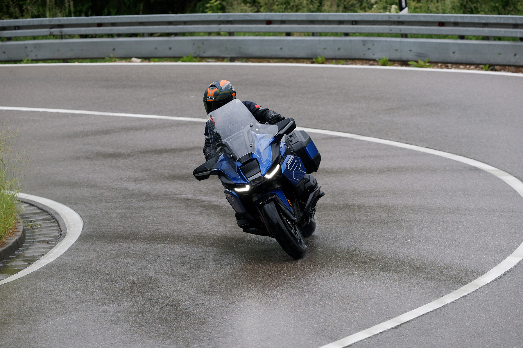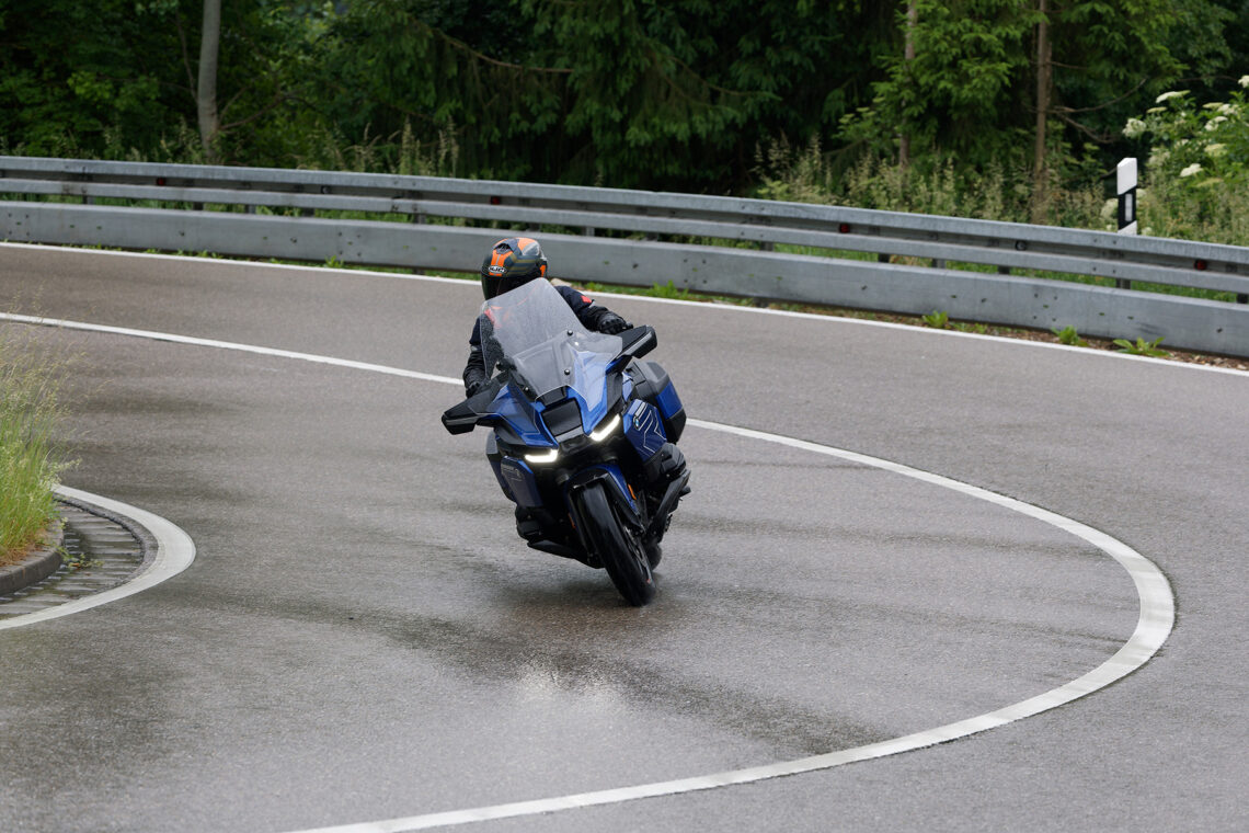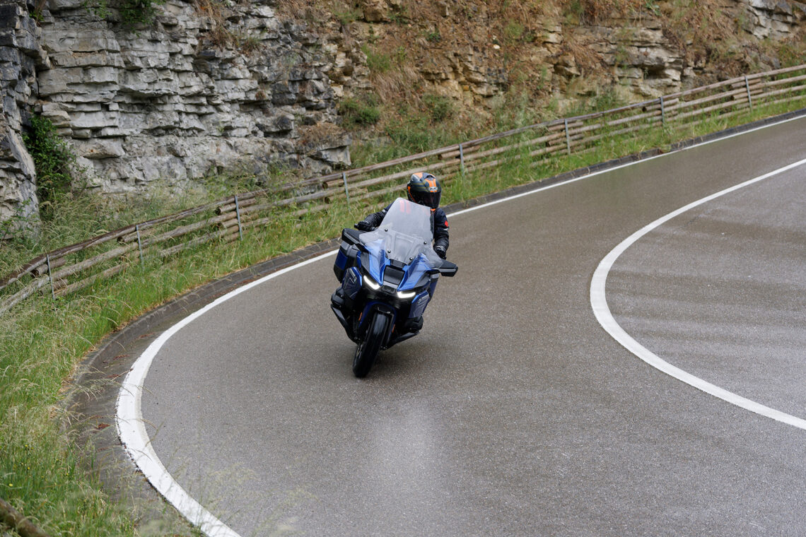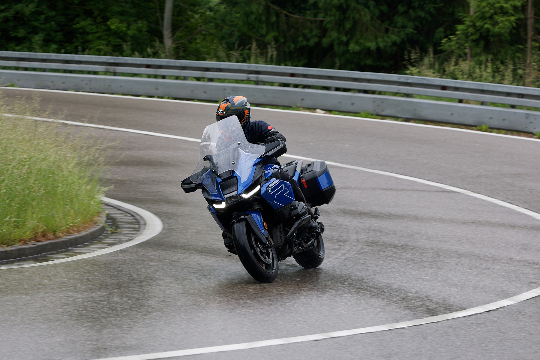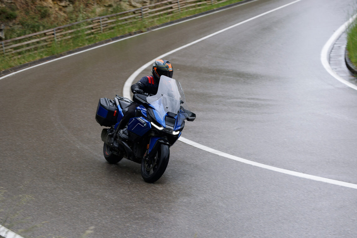 El motor de la nueva R 1300 RT es el ya visto en la GS, con ese pulmón tan fuerte en la zona media, y su característica configuración más compacta. No obstante, tengo la sospecha de que la generación anterior de motor era más fino o suave en términos de reverberación mecánica. En cuanto a rendimiento, es increíble lo que van mejorando estos motores. Estamos ante un motor que empuja en todos lados, quizá la zona alta no, pero hasta que llegas a ella ya te has acabado la carretera. La entrega está repleta de par, y hay que tener tacto si el terreno está deslizante como nos tocó vivirlo a nosotros. Empuja como un motor eléctrico, pero con alma mecánica. No hay picos ni baches en la entrega; es una entrega llena, continua. Y cuando lo acompañas con una caja de cambios con el sistema automatizado ASA, que ha dejado atrás toda rusticidad bávara de hace años, siendo rápida, precisa y silenciosa, uno empieza a entender lo que significa el valor del avance tecnológico. Podría decir que es el mejor sistema de cambios automatizados de nueva hornada que están apareciendo últimamente. El de KTM —aunque a todos nos sorprenda— es el que podría mirarle de tú a tú, pero el resto... les queda un poco de camino para llegar a la suavidad y experiencia del ASA.