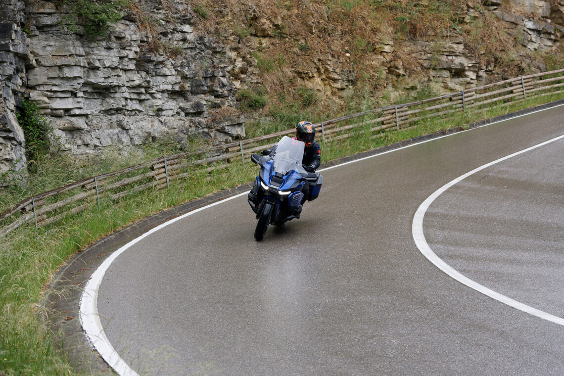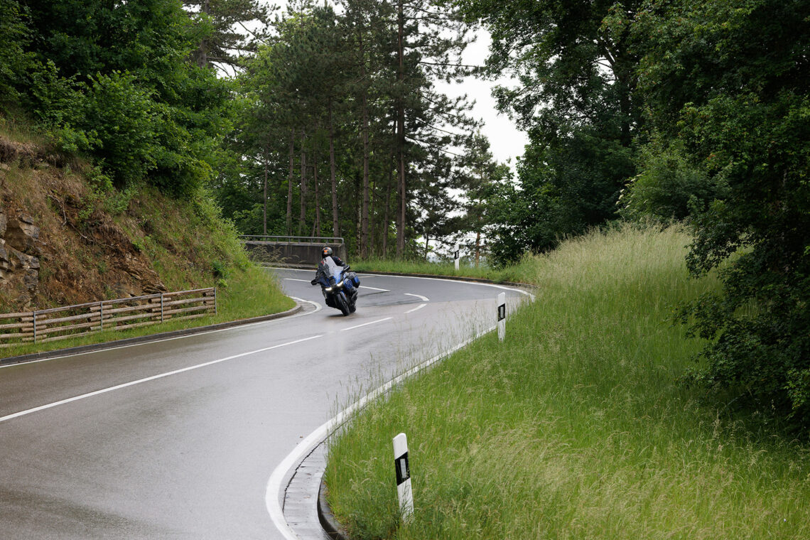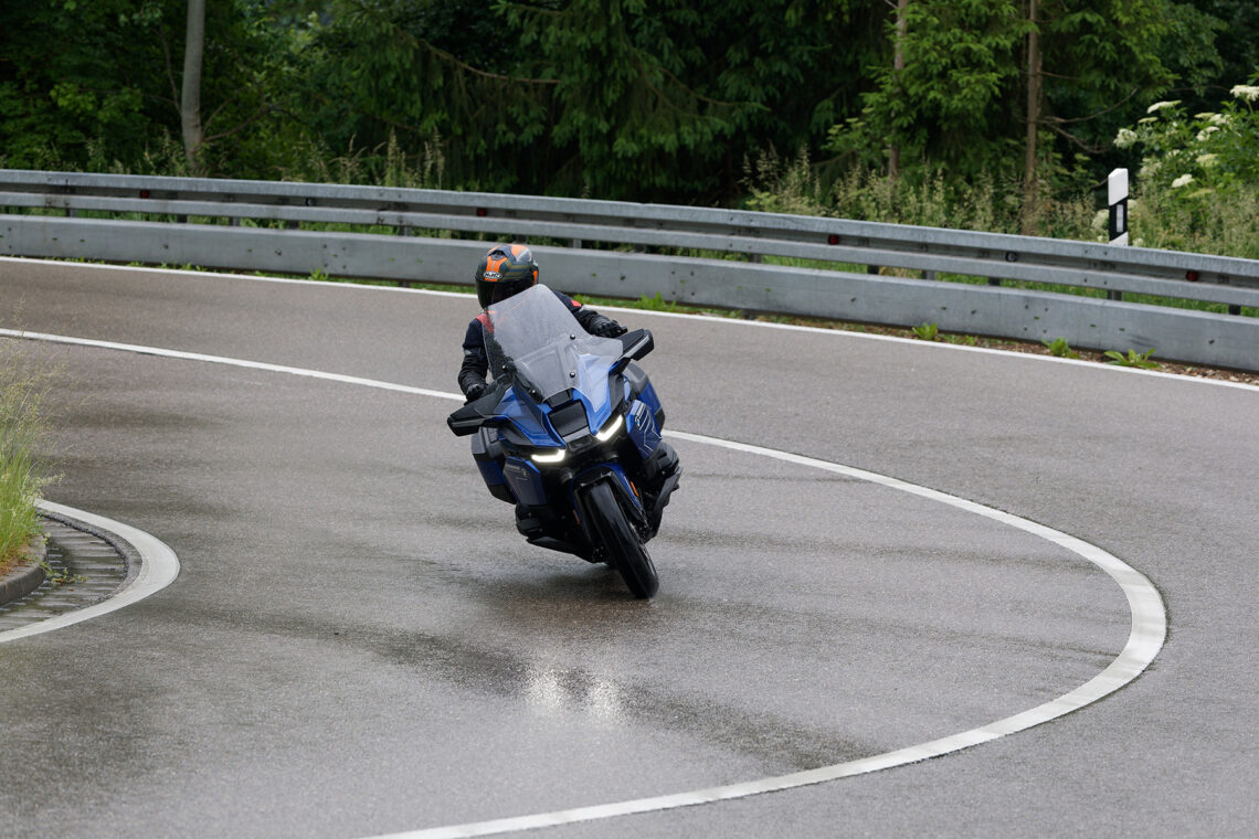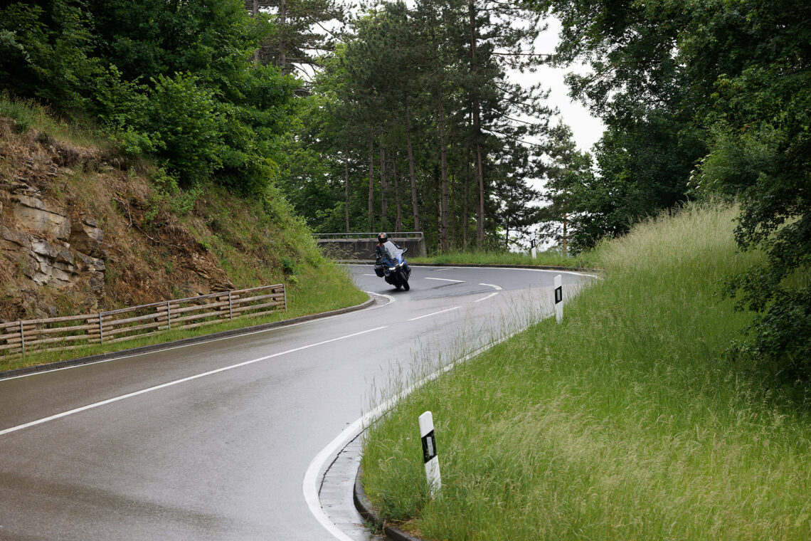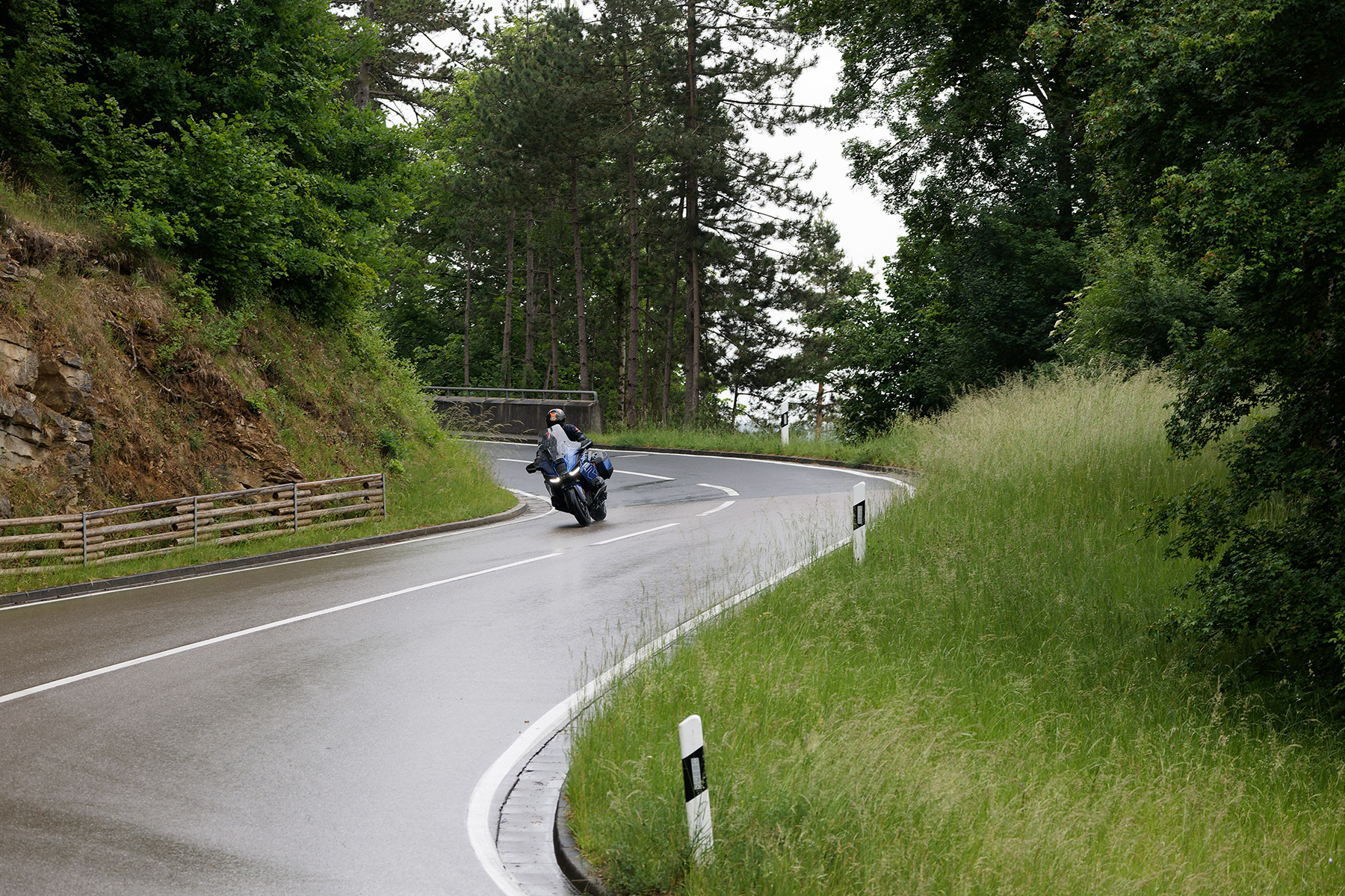 El motor de la nueva R 1300 RT es el ya visto en la GS, con ese pulmón tan fuerte en la zona media, y su característica configuración más compacta. No obstante, tengo la sospecha de que la generación anterior de motor era más fino o suave en términos de reverberación mecánica. En cuanto a rendimiento, es increíble lo que van mejorando estos motores. Estamos ante un motor que empuja en todos lados, quizá la zona alta no, pero hasta que llegas a ella ya te has acabado la carretera. La entrega está repleta de par, y hay que tener tacto si el terreno está deslizante como nos tocó vivirlo a nosotros. Empuja como un motor eléctrico, pero con alma mecánica. No hay picos ni baches en la entrega; es una entrega llena, continua. Y cuando lo acompañas con una caja de cambios con el sistema automatizado ASA, que ha dejado atrás toda rusticidad bávara de hace años, siendo rápida, precisa y silenciosa, uno empieza a entender lo que significa el valor del avance tecnológico. Podría decir que es el mejor sistema de cambios automatizados de nueva hornada que están apareciendo últimamente. El de KTM —aunque a todos nos sorprenda— es el que podría mirarle de tú a tú, pero el resto... les queda un poco de camino para llegar a la suavidad y experiencia del ASA.