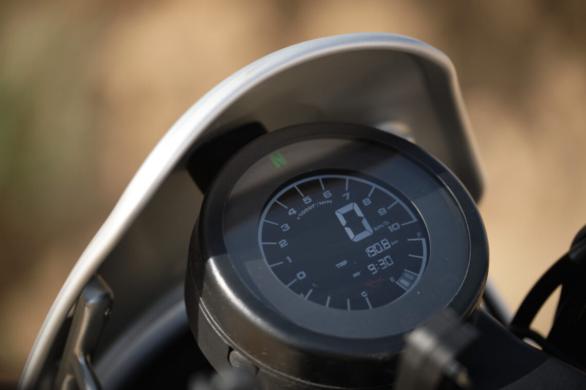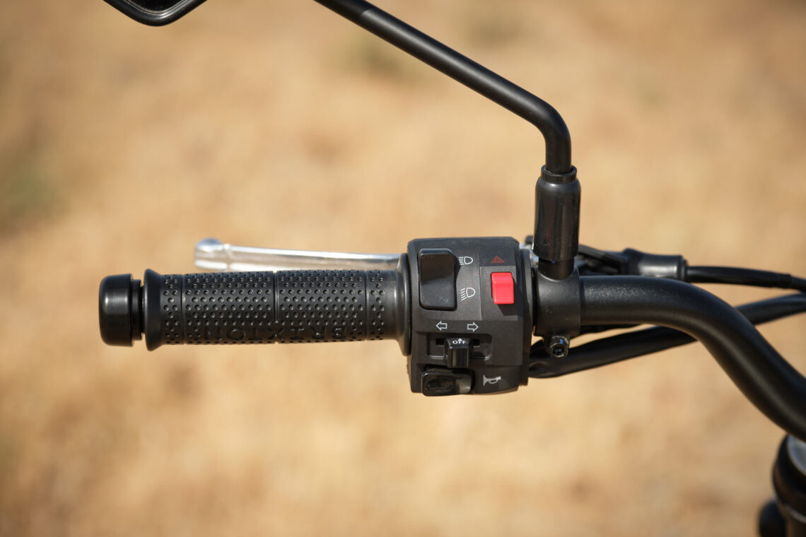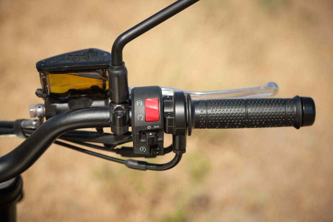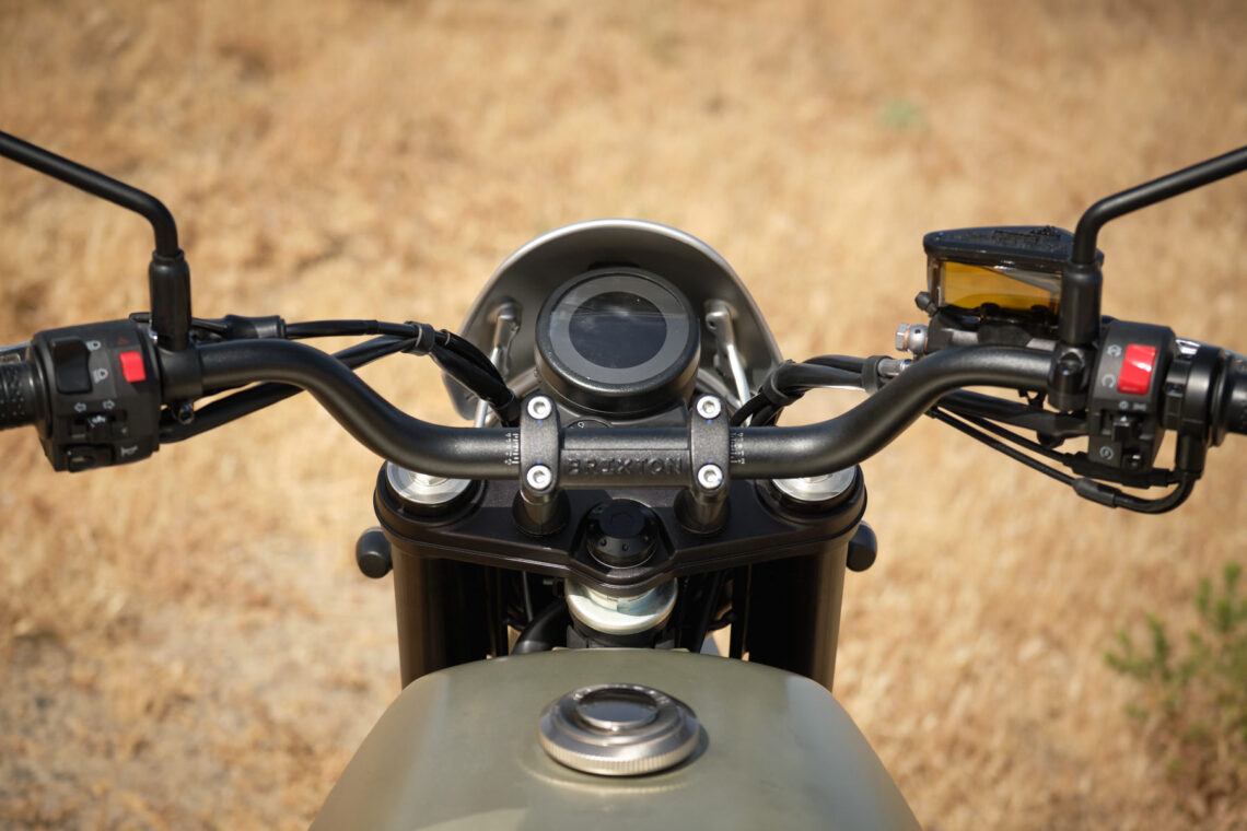 Nada más subirnos a la Brixton Crossfire 500 XC vemos una moto más estrecha de lo que aparenta a la distancia, dura de asiento y mandos (embrague y acelerador). Recuerda a esas motos de los años 80, austeras, duras, y sencillas. Una vez te subes notas como el chasis está prácticamente a flor de piel del asiento, y el depósito se muestra bastante presente en la entrepierna, aunque sin llegar a ser incómodo. Las estriberas las encuentras bastante bajas y cómodas, y la posición de mandos elevada y retraída, con un claro enfoque off-road.