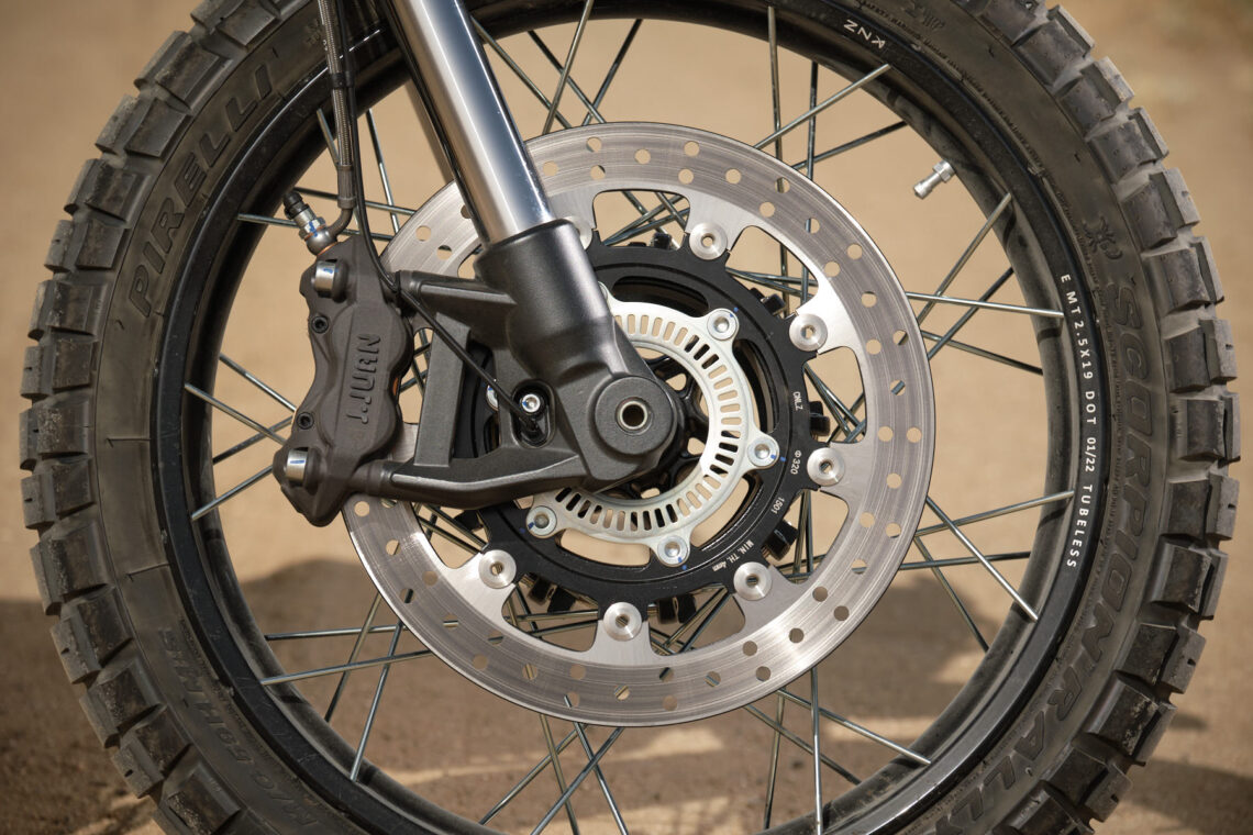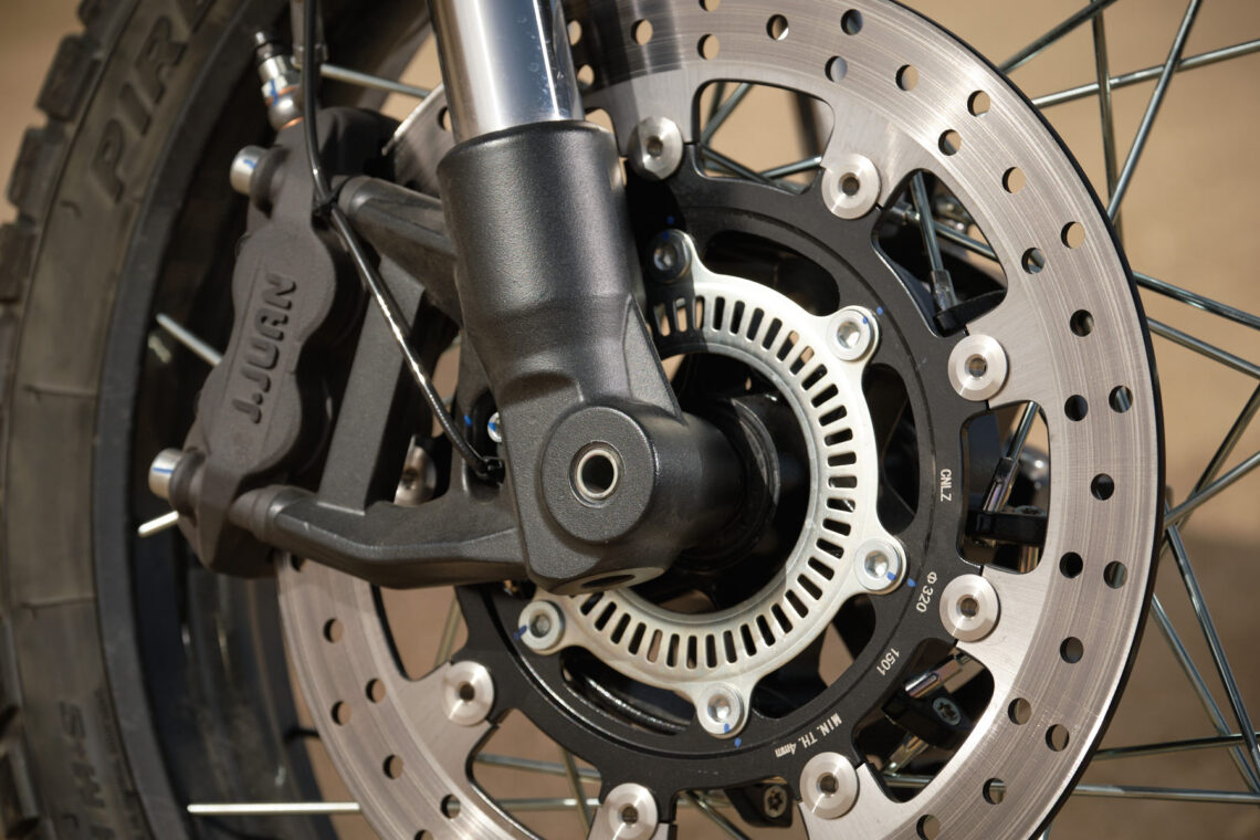 Los frenos es uno de sus puntos que difieren bastante según vayas por asfalto o campo. En campo son ideales, muy modulables, con bastante recorrido y una mordida progresiva. En carretera se pueden quedar un poco justos si los utilizas por separado. Seguramente una pastilla más deportiva solucione esto, aunque ojo por campo, se volverá más agresiva. Respecto a su interacción con el ABS, este es bastante permisivo, algo que se agradece ya no solo por campo, que también, sino por asfalto al no llevar neumáticos lisos de carretera, ya que si no estaría "saltando" contínuamente.