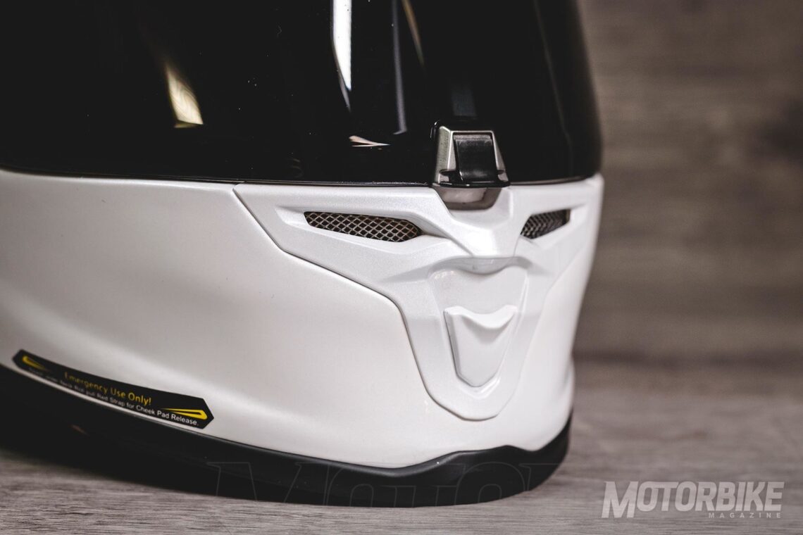 El diseño como ya hemos mencionado resulta muy moderno, en línea de la nueva tendencia de cascos deportivos, pero no por ello resulta un casco incómodo o inadecuado para uso en motos no R. Cierto es que no cuenta con ventajas que un casco sport-touring ofrece, como conexión interior de intercomunicador o visor desplegable adicional en el interior, pero tampoco debemos descentrarnos; estamos ante un casco deportivo puro y duro. Que lo usemos fuera de él es perfectamente posible, tal y como sucede en mi caso. No resulta incómodo ni me choca la nuca en la cazadora ni el mentón en los hombros al girar la cabeza (algo que si me ha sucedido con otros cascos deportivos). La boca del casco es muy estrecha a la vista, pero no es más que una cobertura inicial de tela/textil; introducimos la cabeza vemos que es un casco bastante fácil de quitar y poner. Por supuesto cuenta con mentonera, naricera, y el cierre es el clásico que nunca falla de doble D (doble hebilla).