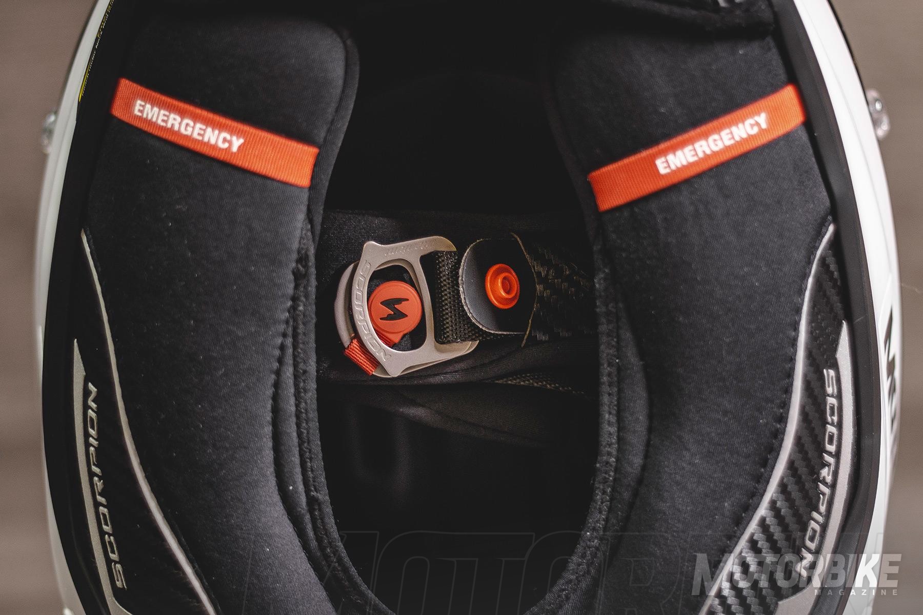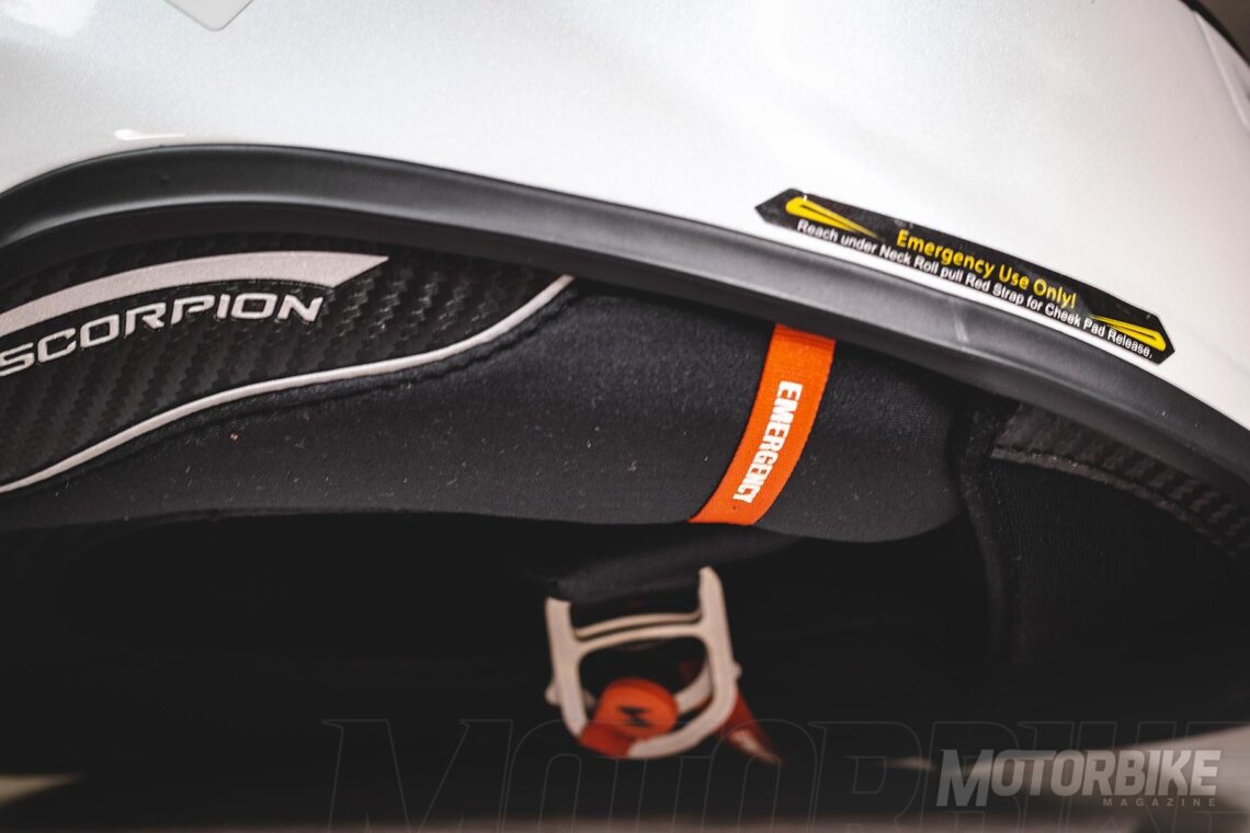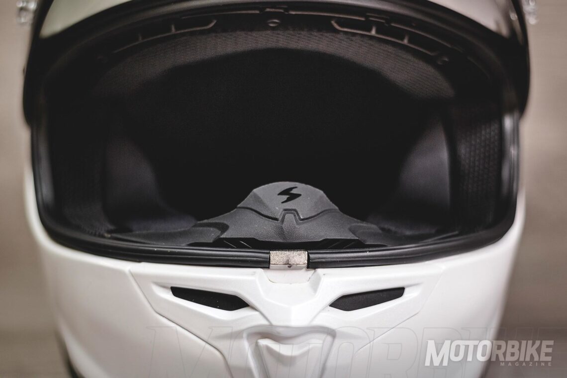 El interior es una de las claves de este Scorpion EXO-R1 Air; personalmente tiendo a coger una talla que me venga justa, para que con el viento y la alta velocidad no se me mueva, pero no ha sido el caso ya que la mayoría de Scorpions cuentan con el patentado sistema Airfit. Este sistema dispone de carrilleras e interiores hinchables mediante una discreta "pera" de aire el mentón. De este modo, puedo llevarlo sin hinchar en el día a día, resultando un casco muy cómodo, y puedo hincharlo para que el casco me quede un pelín más justo en días de circuito o viajes a alta velocidad.
