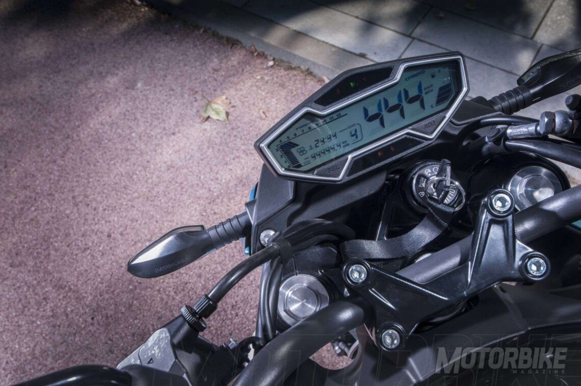 Subirte a la CFMoto 400NK es muy fácil, más con una altura de asiento muy accesible para casi todo el mundo y perfecta para circular con agilidad. La postura es erguida y cómoda, sobre todo para la ciudad. Además, el manillar ancho refuerza su imagen de naked 'en condiciones' y en el display digital LCD puedes ver la información fácilmente con un rápido vistazo. El asiento tiene muy buen agarre y, para ser una naked, el asiento del pasajero también es cómodo, aunque tendrá que conformarse con unas hendiduras bajo el asiento en ausencia de asideros. Es lo que hay que sacrificar en pos del diseño.