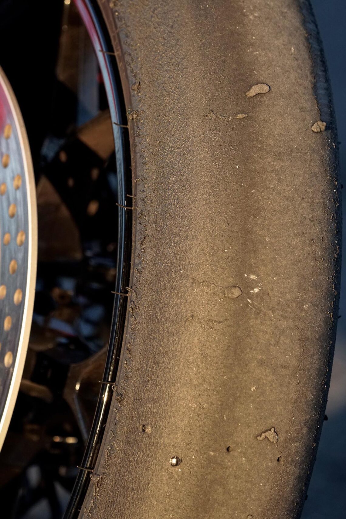 Volvemos de pista y las presiones ya están en su punto perfecto, sin embargo apreciamos cierta degradación excesiva en el flanco izquierdo (la zona fría de Jerez) ... podría ser falta de temperatura, pero dada la circunstancia (casi 25º y rodando por debajo del 55 no es el caso). La Honda CBR1000RR-R Fireblade 2020 es una moto muy rígida, tanto de chasis como de suspensiones, y aunque he ajustado el hidráulico a una regulación más rápida (suave), el muelle de las suspensiones no puedo cambiarlo. Evidentemente la moto no estaba traccionando del todo como debería, lo que explicaría el estrés que mostraba el neumático trasero en pista y la degradación consecuente.