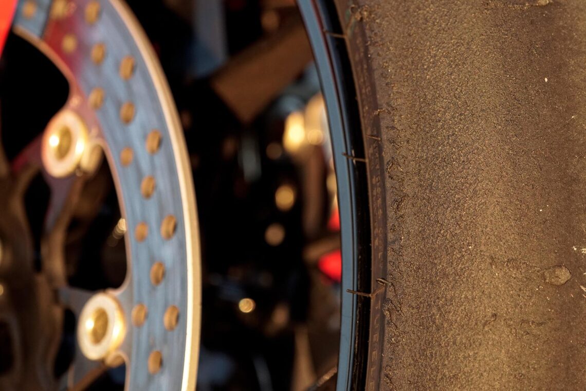 Llegamos a pista con un 52 alto, un tiempo algo más respetable, sobre todo si tenemos en cuenta que hay mucho tráfico. El Dunlop D212 ya exhibe una clara degradación en el flanco izquierdo. En la última tanda que salimos a pista ya no había prácticamente grip en las curvas a izquierda. Lamentablemente esto está directamente relacionado con una falta de tracción debido al rígido set up que trae la CBR1000RR-R 2020 de serie, provocando un desgaste acelerado en el neumático trasero, llegando incluso a matarlo en el flanco izquierdo, pues el derecho seguía con mucha vida.