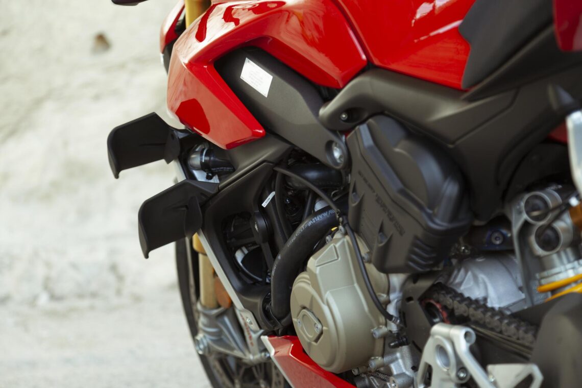 Y para finalizar, los aclamados aletines laterales o apéndices aerodinámicos que encontramos en los laterales de la Ducati Streetfighter V4 S; se tratan de dos alerones en cada lado de la moto con una capacidad de carga aerodinámica de hasta 28 kg a 270 km/h. Como curiosidad, Ducati ofrece la posibilidad a modo de extra opcional de instalar dichos apéndices aerodinámicos en fibra de carbono.
