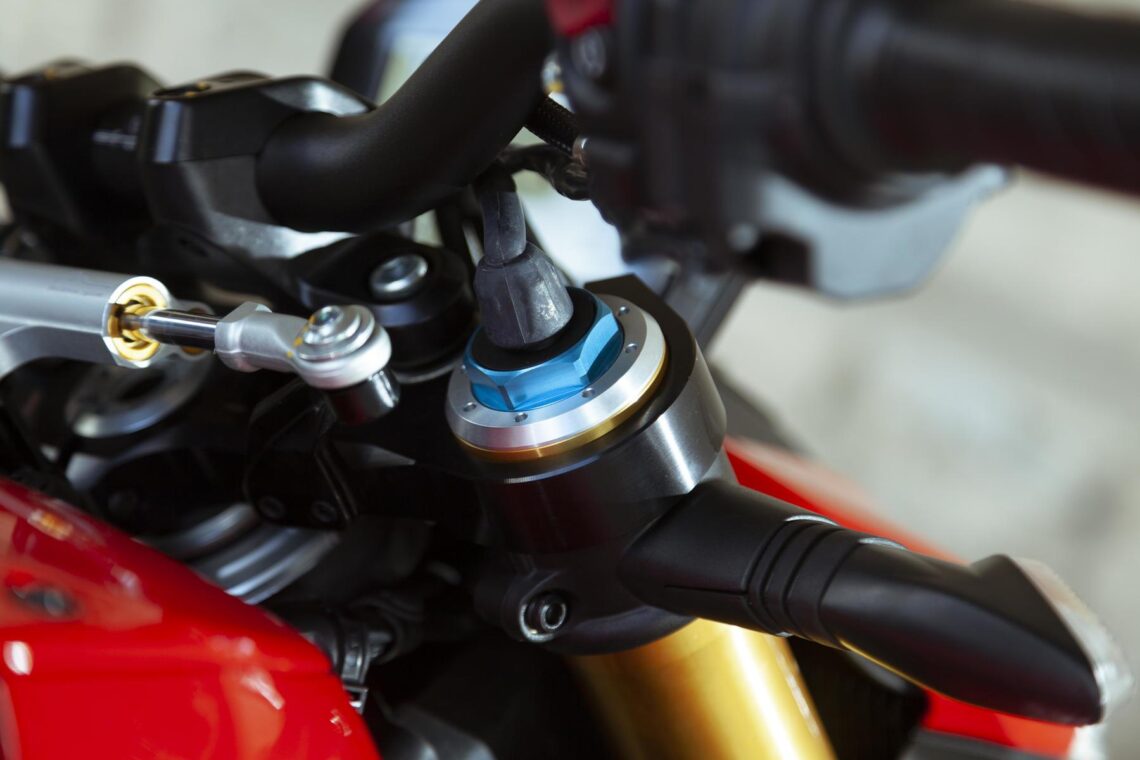 El ángulo de lanzamiento de la Ducati Streetfighter V4 es de 24,5º (avance 100mm) pero cuenta con una pipa de dirección excéntrica que permite una regulación de hasta 26º de lanzamiento.