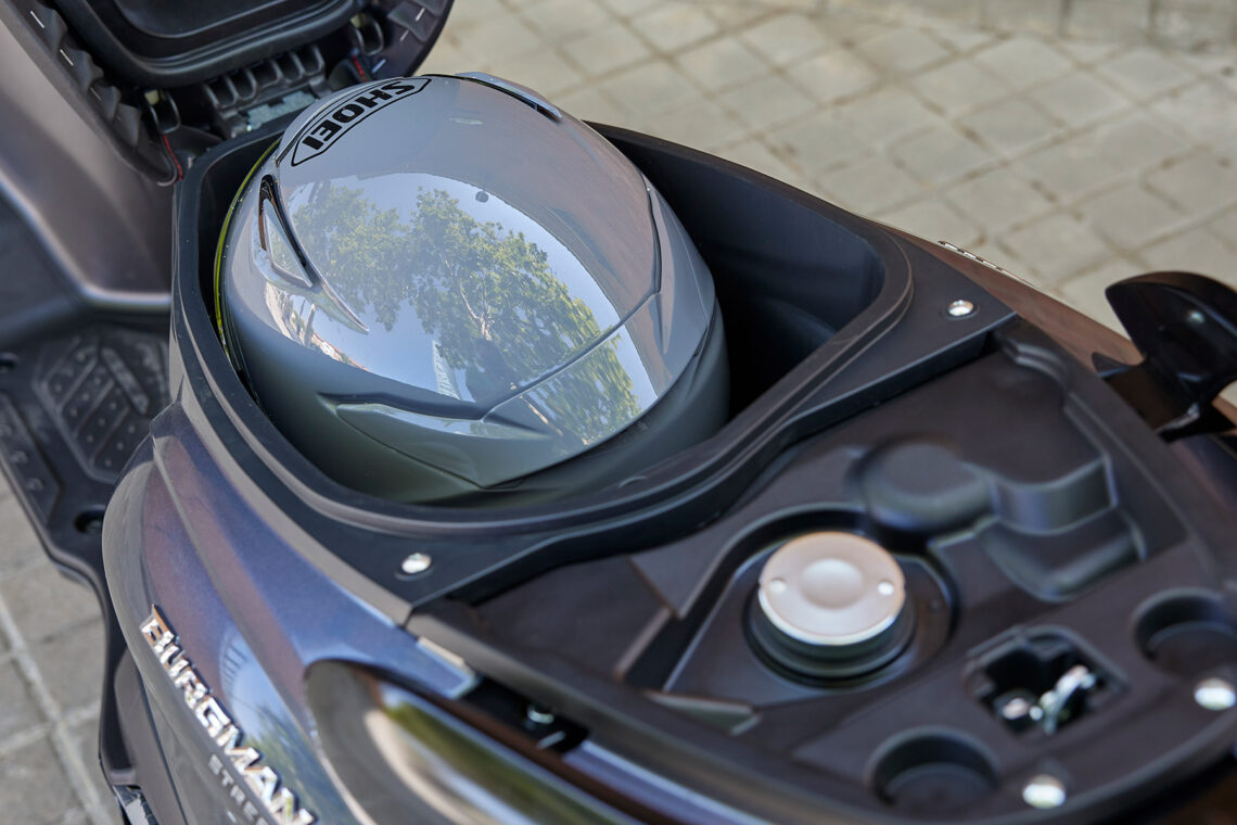 A título práctico, la información de la instrumentación del dúo Avenis/Burgman (incluye nivel de gasolina, consumo medio, reloj horario, barra de temperatura de refrigerante o chivato ECO -para indicarte que realizas una conducción eficiente-, etc), el suelo plano, los ganchos o las guanteras son ideales para el día a día, con el plus de la parrilla trasera en el Burgman para aumentar aún más la capacidad de carga. Echo en falta algo más de hueco bajo el asiento, que puede albergar un casco integral pero queda lejos de la grandiosa capacidad del antiguo Burgman y que, por ejemplo, impide meter una mochila estándar cargada. El motivo es que, ahora, el depósito de gasolina se encuentra en la parte trasera del scooter.