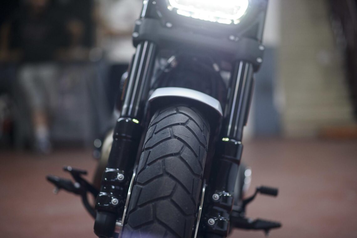 No podemos olvidar que esta Fat Bob viene calzada con unos neumáticos muy peculiares: Dunlop H-D Series D427. La medida es de 16 pulgadas en ambas llantas con unos balones de 150 delante y 180 detrás. Pero lo curioso de estas gomas es su dibujo profundo que le da cierto toque trail sin serlo, y que le otorga un comportamiento en asfalto para nuestro gusto excelente.