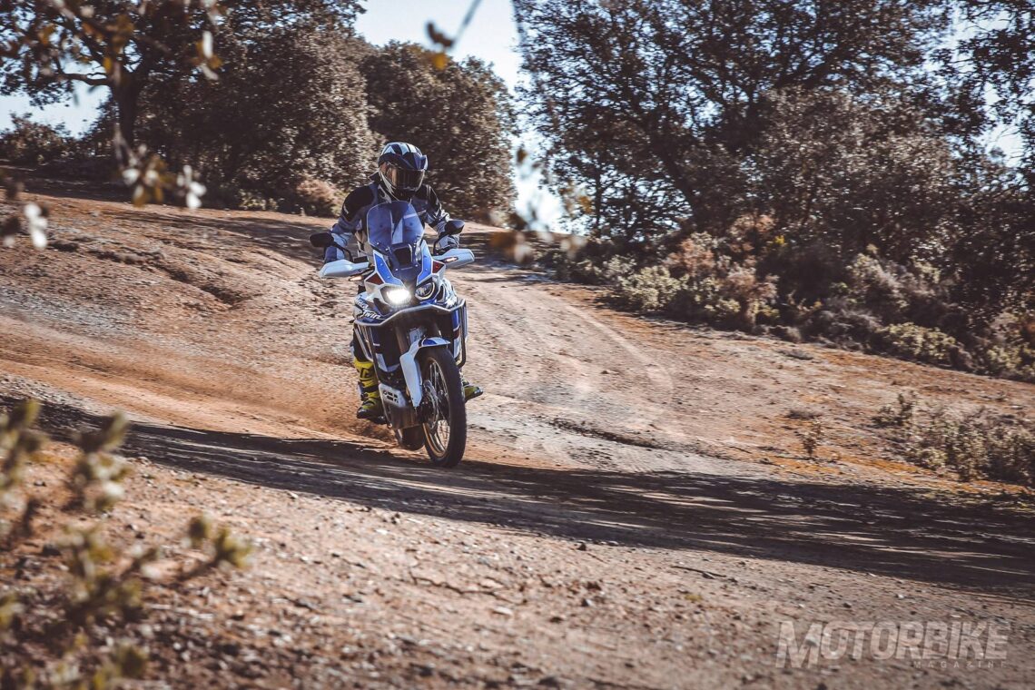Es en la tierra donde saca su carácter CRF y explica por qué lleva estas letras en su nombre oficial. Poco a poco, fui quitando asistencias hasta desconectar el control de tracción para probarla de una forma más pura, pero sorprende la seguridad que aporta la leve asistencia del ajuste 1. La posición de conducción de pie es muy cómoda, algo que mejora con el asiento recto que te permite moverte según las condiciones del firme en cada instante. Con las piernas tienes muy buen agarre sobre el depósito a pesar de su anchura.