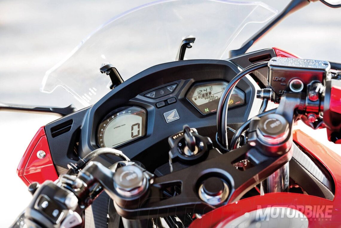 Después de haber probado la naked CB650F que utiliza la misma base, lo primero de lo que me di cuenta al subirme a la CBR650F es de que la posición es claramente más deportiva. Sin embargo, esta agresividad no está reñida con la comodidad gracias a que los semimanillares están sobreelevados y permiten una gran movilidad sobre el tren delantero. El resto del cuerpo está rápidamente acomodado y el acceso al suelo está muy cercano a los pies para la mayoría de los conductores. Las pantallas de la instrumentación son iguales a la CB. El marco y el carenado hacen que hagan menos reflejos para ver correctamente toda la información que nos proporciona, aunque en ella sería de gran ayuda incluir un indicador de marcha engranada, muy útil en esta cuatro cilindros tan 'juguetona'.
