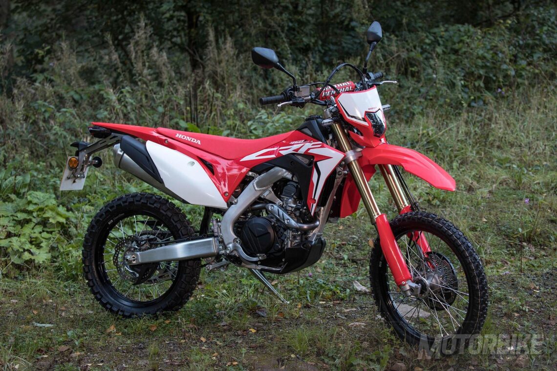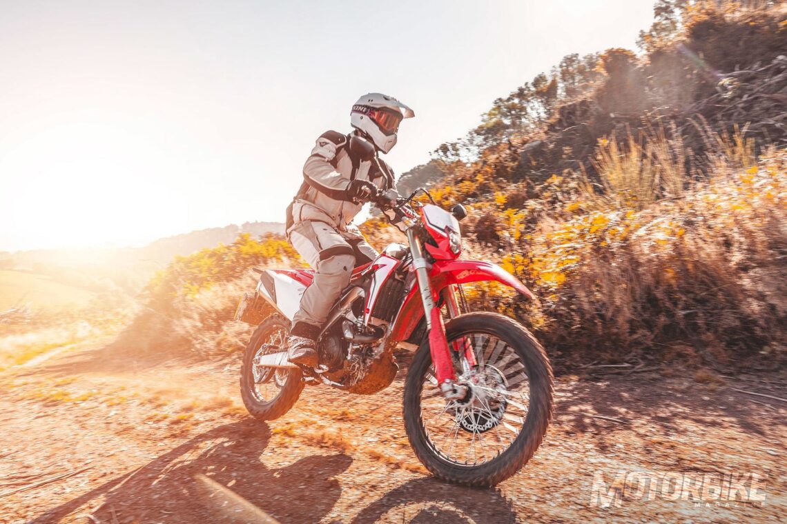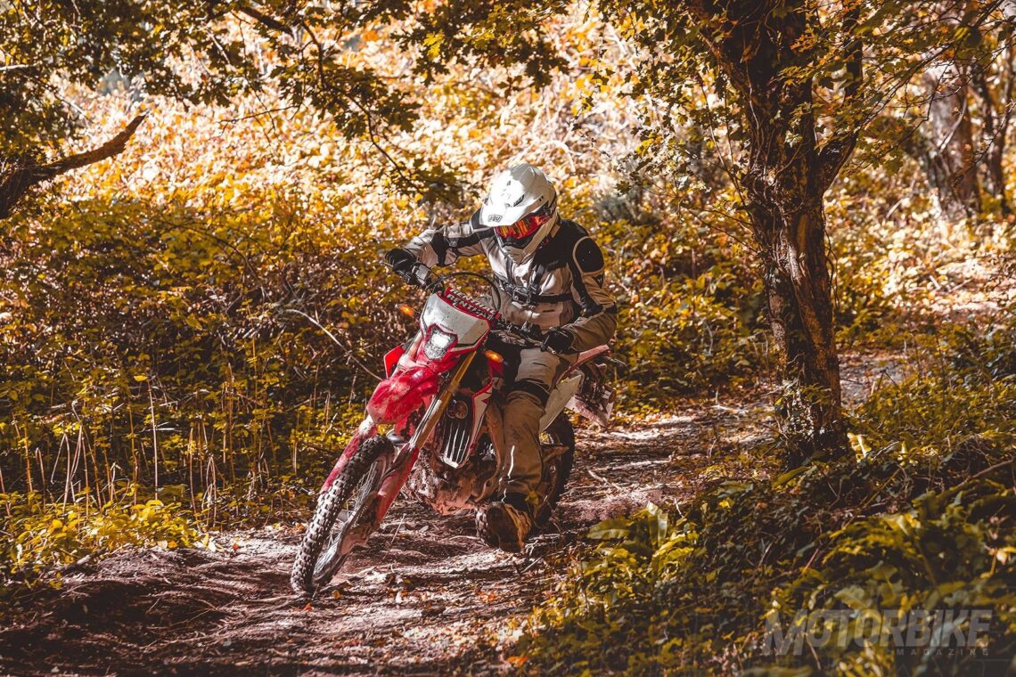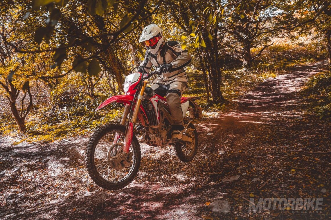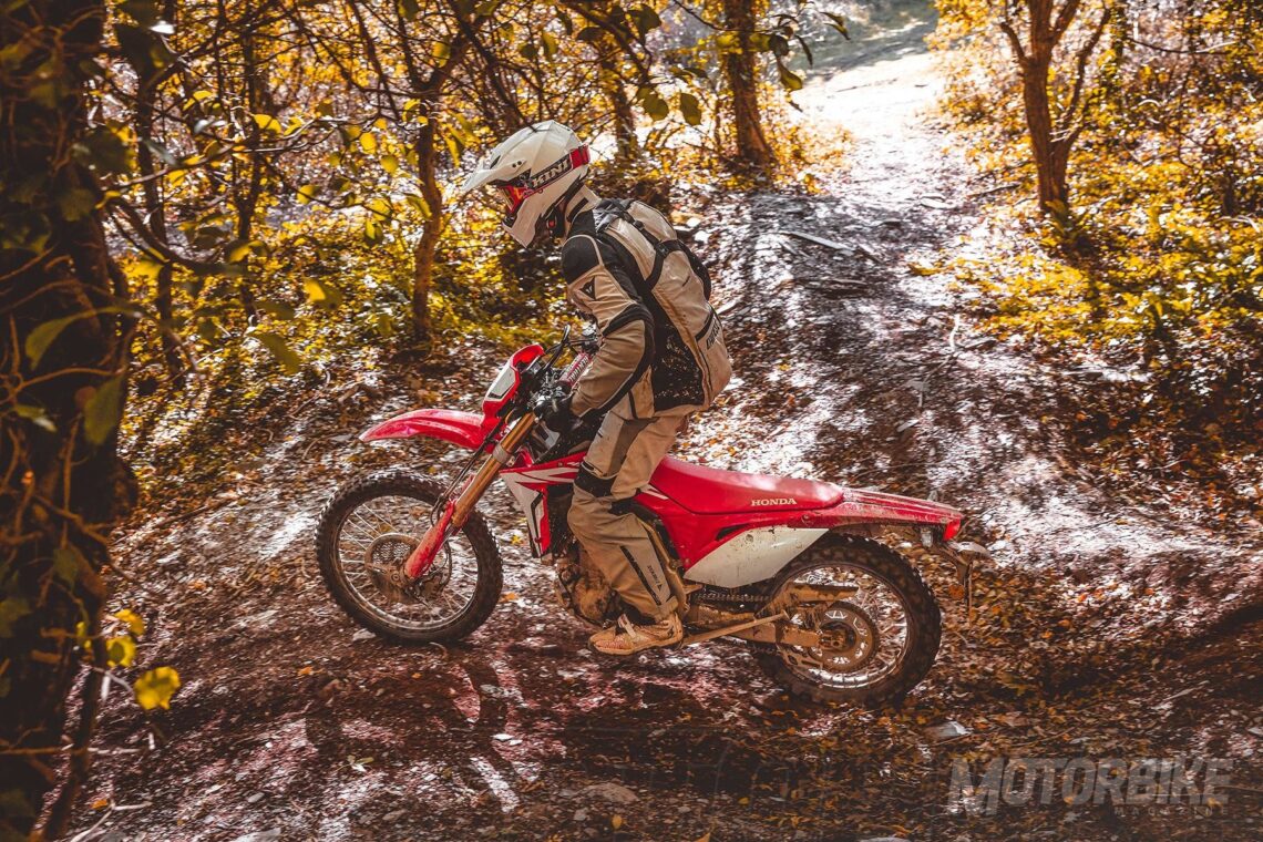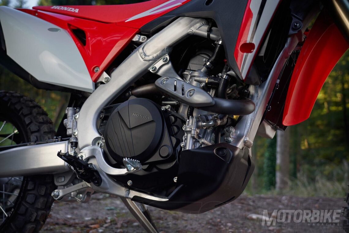 En lo que respecta al monocilíndrico de 449,7 cc, apreciamos una serie de cambios significativos orientados a cumplir con la normativa Euro 4, disminuir la agresividad y mejorar la usabilidad respecto a la versión de cross. Su cigüeñal más robusto y pesado hace que tenga un 12% más de inercia y, en consecuencia, un tacto más dócil en el puño derecho. Añade una sexta velocidad (cinco en la R) para un mayor desarrollo en marcha y desahogo del motor. En el pistón se ha incluido un tercer aro para aumentar su durabilidad, llegando así a los 30.000 km sin necesidad de revisiones importantes. No obstante, habría que hacer un pequeño mantenimiento orientado al cambio de aceite y filtros cada 1000 km. El airbox, rediseñado con sistema PGM-FI, nos da unas cifras de 32 Nm de par máximo a 3500 rpm y 25 cv a 7500 rpm como pico de potencia, aptas para los conductores del carnet A2.