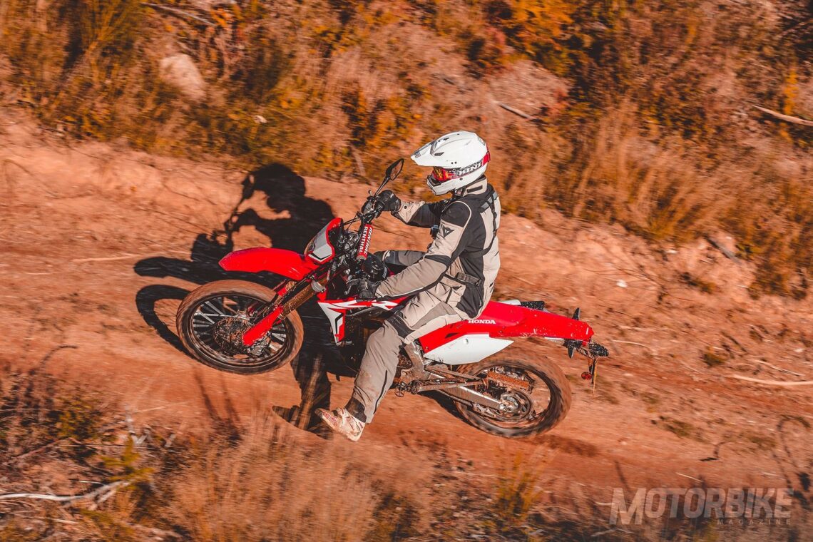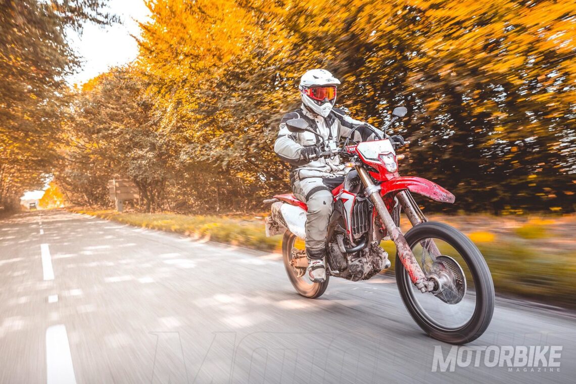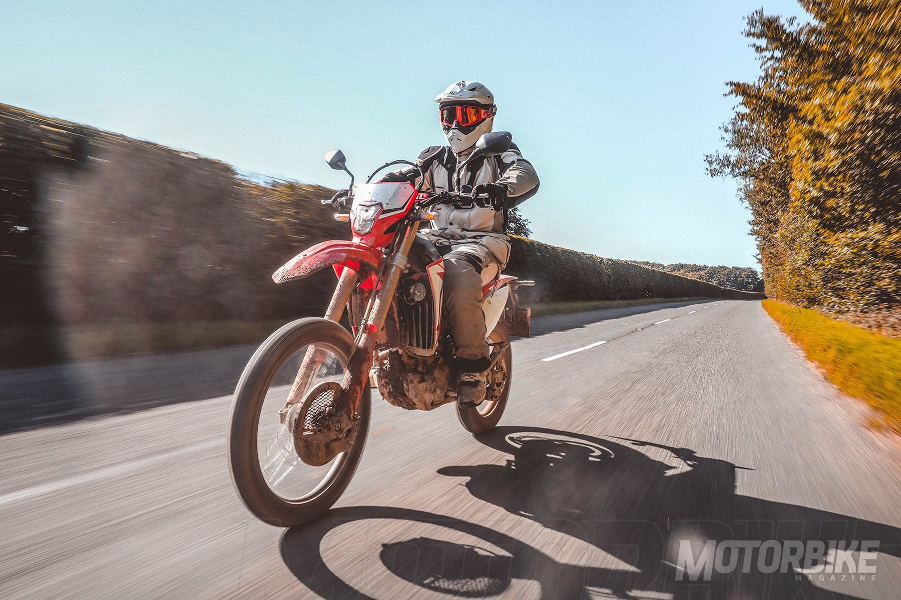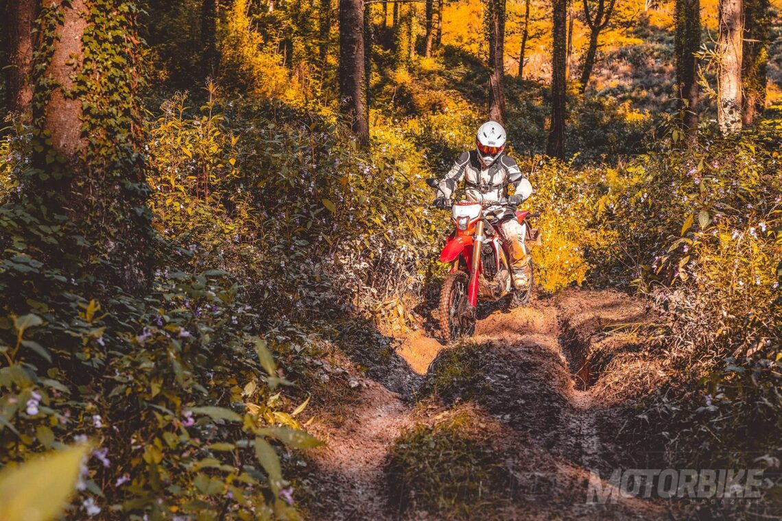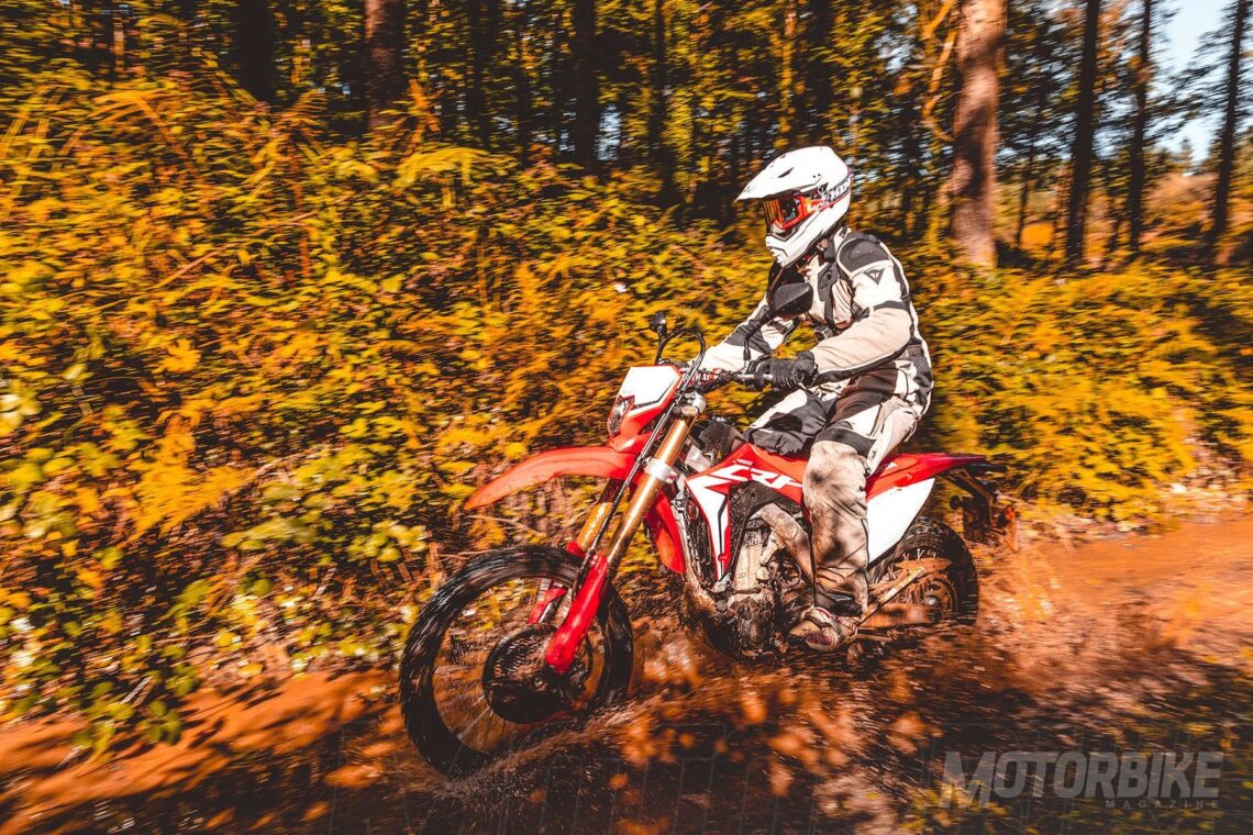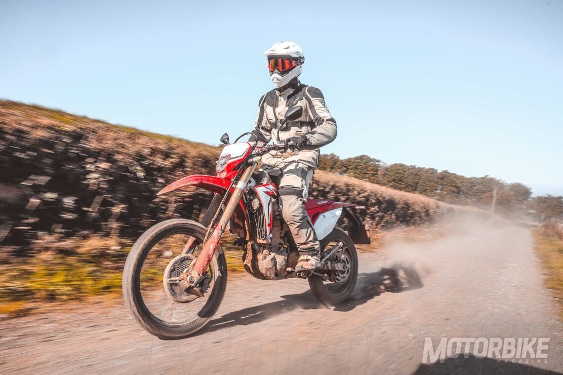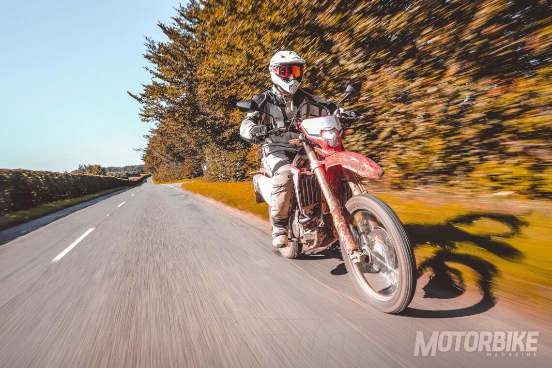 En lo que respecta al monocilíndrico de 449,7 cc, apreciamos una serie de cambios significativos orientados a cumplir con la normativa Euro 4, disminuir la agresividad y mejorar la usabilidad respecto a la versión de cross. Su cigüeñal más robusto y pesado hace que tenga un 12% más de inercia y, en consecuencia, un tacto más dócil en el puño derecho. Añade una sexta velocidad (cinco en la R) para un mayor desarrollo en marcha y desahogo del motor. En el pistón se ha incluido un tercer aro para aumentar su durabilidad, llegando así a los 30.000 km sin necesidad de revisiones importantes. No obstante, habría que hacer un pequeño mantenimiento orientado al cambio de aceite y filtros cada 1000 km. El airbox, rediseñado con sistema PGM-FI, nos da unas cifras de 32 Nm de par máximo a 3500 rpm y 25 cv a 7500 rpm como pico de potencia, aptas para los conductores del carnet A2.