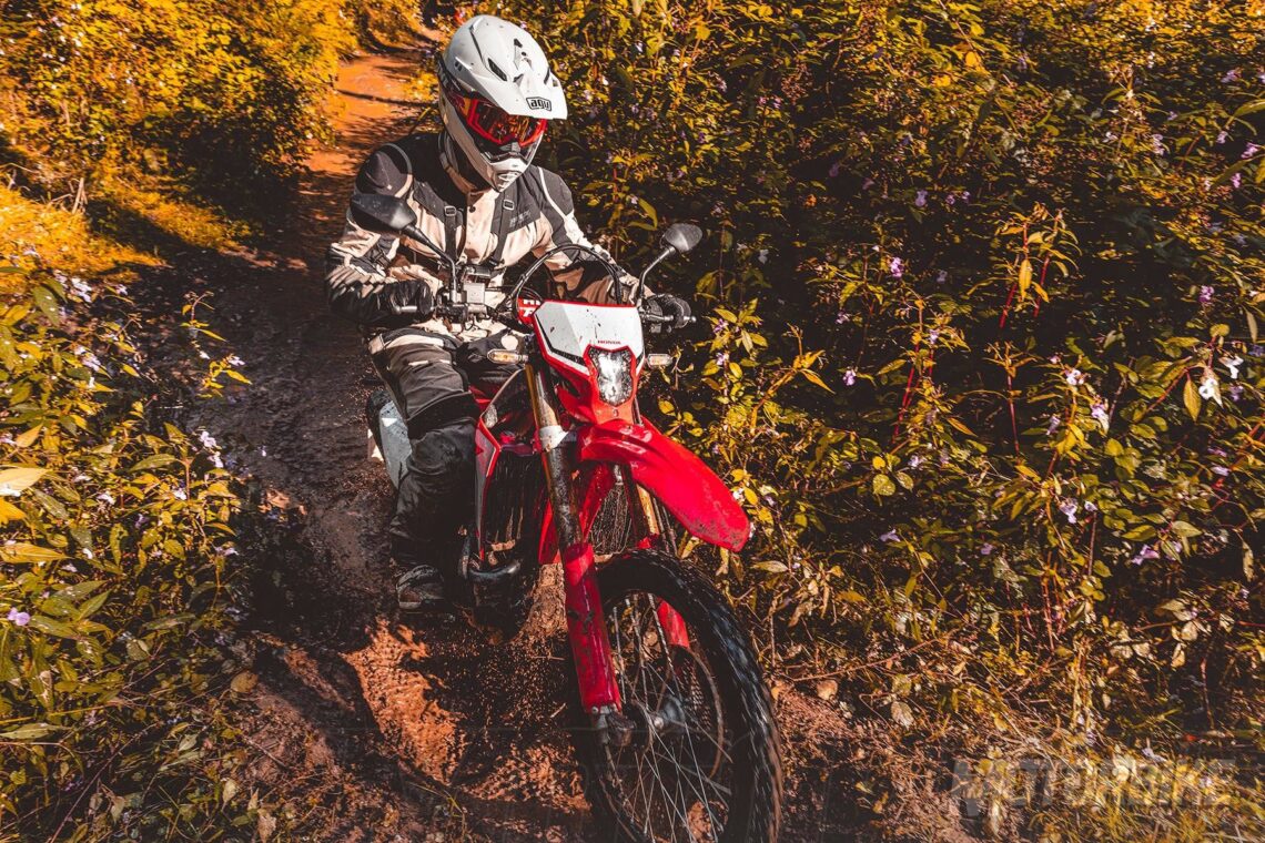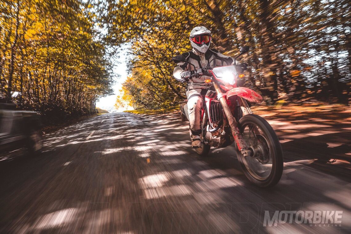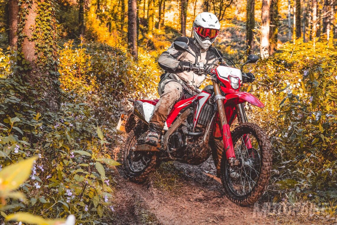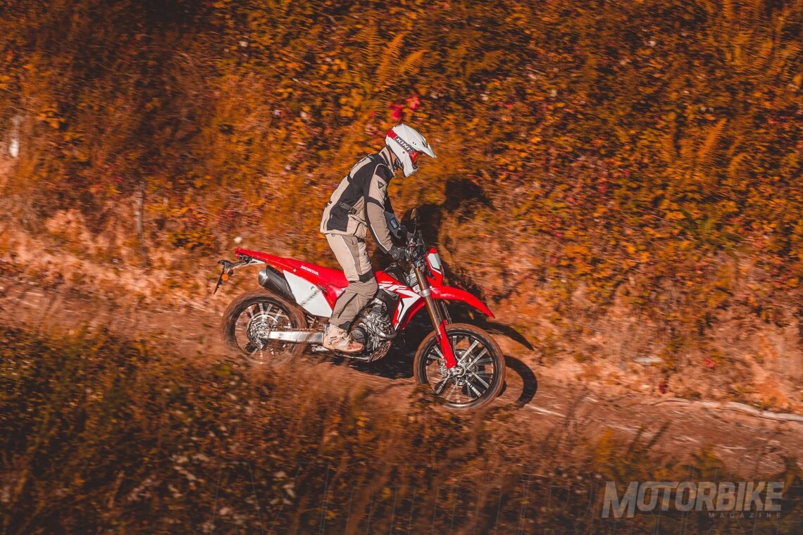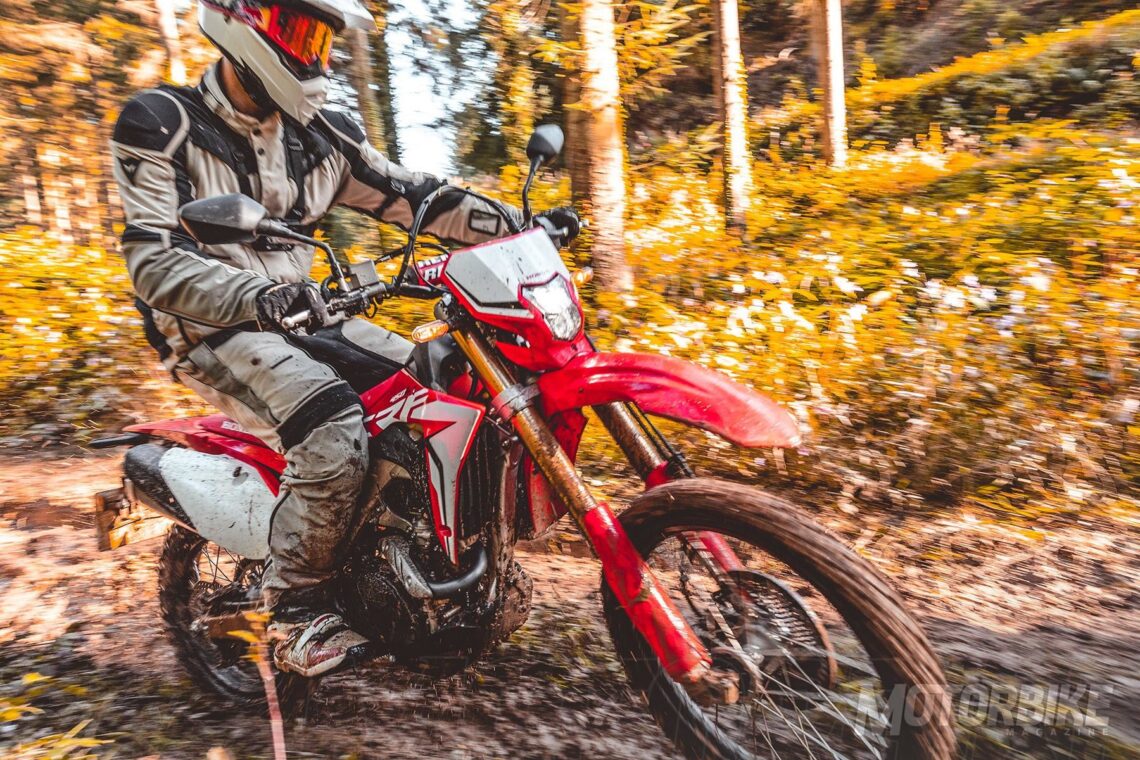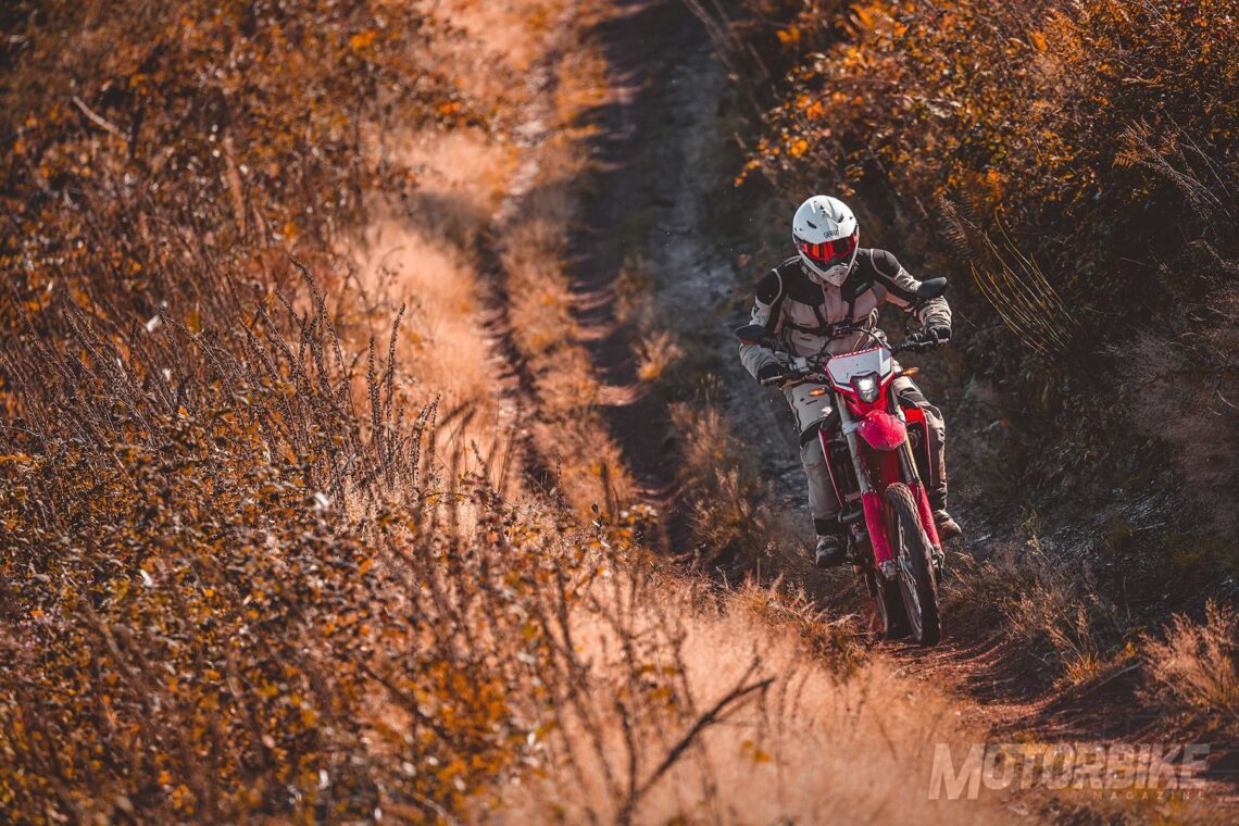 En lo que respecta al monocilíndrico de 449,7 cc, apreciamos una serie de cambios significativos orientados a cumplir con la normativa Euro 4, disminuir la agresividad y mejorar la usabilidad respecto a la versión de cross. Su cigüeñal más robusto y pesado hace que tenga un 12% más de inercia y, en consecuencia, un tacto más dócil en el puño derecho. Añade una sexta velocidad (cinco en la R) para un mayor desarrollo en marcha y desahogo del motor. En el pistón se ha incluido un tercer aro para aumentar su durabilidad, llegando así a los 30.000 km sin necesidad de revisiones importantes. No obstante, habría que hacer un pequeño mantenimiento orientado al cambio de aceite y filtros cada 1000 km. El airbox, rediseñado con sistema PGM-FI, nos da unas cifras de 32 Nm de par máximo a 3500 rpm y 25 cv a 7500 rpm como pico de potencia, aptas para los conductores del carnet A2.