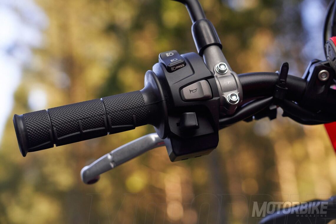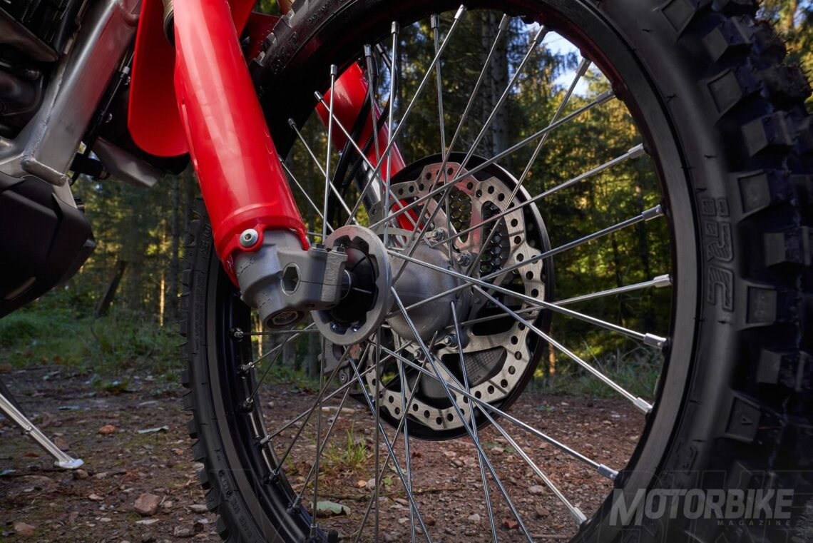 La sensación es de una moto ágil, dócil y muy confiable, con la que si tienes un error te va a perdonar e incluso te lo corregirá ella sola. Se desenvuelve muy bien en todo tipo de situaciones y la suspensión de horquilla telescópica invertida de 305 mm de recorrido, trabaja a la perfección para que tú sólo tengas que ocuparte de dar gas. El tacto, tanto de los frenos como del embrague, es una delicia y a pesar de haber estado horas poniendo a prueba mis antebrazos a base de accionar ambas manetas, no tuve la sensación de agarrotamiento propia de una jornada así. Un dedo es suficiente para controlar la pinza de doble pistón que muerde el disco lobulado de 260 mm de diámetro. La inclinación de las manetas no me resultó del todo cómoda para ir en posición de ataque y no me fue posible modificarla en ese momento, aunque obviamente es un aspecto que se ajusta fácilmente. En el freno trasero tienes que ejercer un poco más de presión para bloquear rueda (240 mm y un pistón), hecho que yo agradezco en una conducción offroad, ya que con las botas de enduro es fácil perder sensibilidad y accionar el freno casi por accidente.