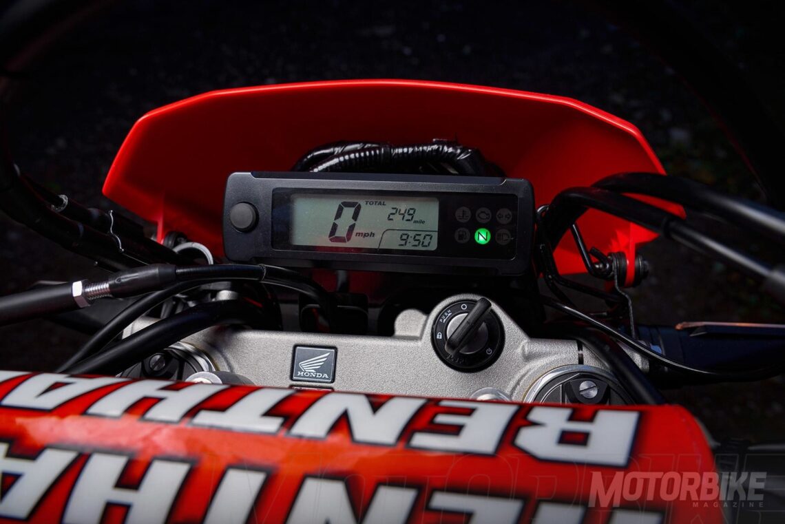 La CRF450L dispone de un pequeño cuentakilómetros de aspecto sencillo, muy bien situado entre la careta frontal y el manillar, y fácilmente visible tanto de pie como sentado. Mediante un solo botón, tenemos acceso al trip A, trip B y al total, siendo la hora y la velocidad visibles en todo momento. El resto de información, como la luz de reserva, intermitentes o luces largas, nos viene dada en forma de pequeños testigos redondos.