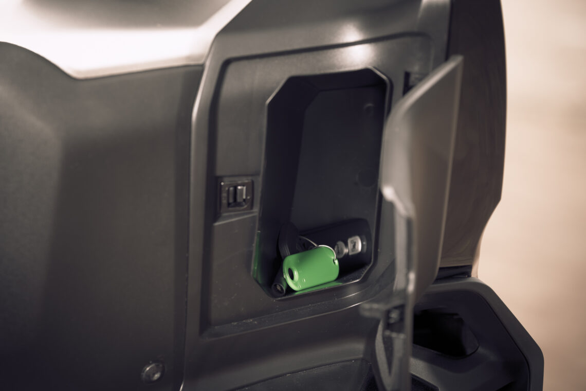 Una vez te subes te das cuenta que es un scooter de altos vuelos, muy cómodo pero, también muy imponente. Todo el frontal de la moto se erige de manera voluminosa (muy similar a la Honda X-ADV), donde encuentras una guanterita lateral, una roseta de arranque, y más arriba la pantalla TFT 5" con toda la información de manera clara y sencilla.