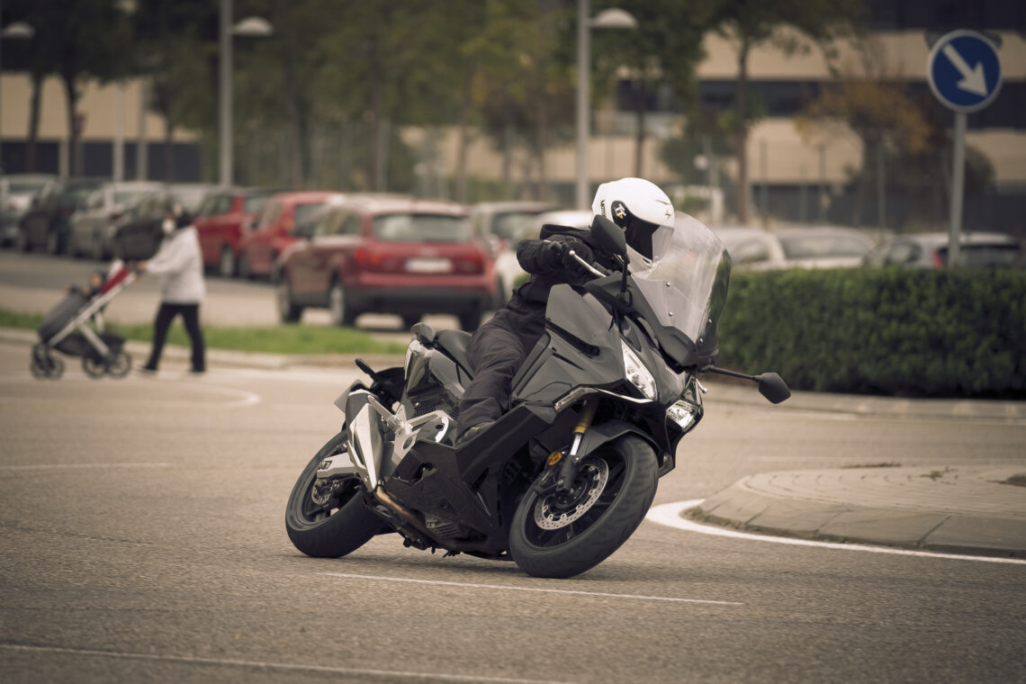 También vemos como el Honda Forza 750 está en cierto modo pensado para circular por carretera abierta a alta velocidad, pues los virajes cerrados a baja velocidad se percibe un poco pesado de delante. No es nada condicionante en la conducción, pero si da un poco la sensación de ir con la presión del neumático delantero baja. Tan fácil como darle un pelín más de gas y el propio motor terminará esos virajes cerrados (estamos hablando de giros muy muy lentos, casi casi de los de ir con el pie en el suelo) levantando la moto por propia inercia.
