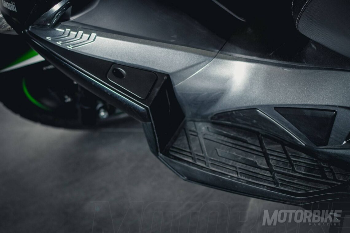 El J125 se distingue por una nueva centralita y un variador diferente para dotar a su motor de un carácter más propio. También es más ‘Kawa’ por tener logos de la marca en las pinzas, nuevas protecciones del escape o la excelente y clarísima instrumentación. Ya puestos, sólo le faltaría freno de estacionamiento, cada vez más habitual en los scooter. A pesar del aspecto deportivo, tanto el conductor como el pasajero del J125 disfrutan de un asiento notablemente cómodo y ergonómico. Además, el ‘paquete’ puede apoyar sus pies en unas estriberas.