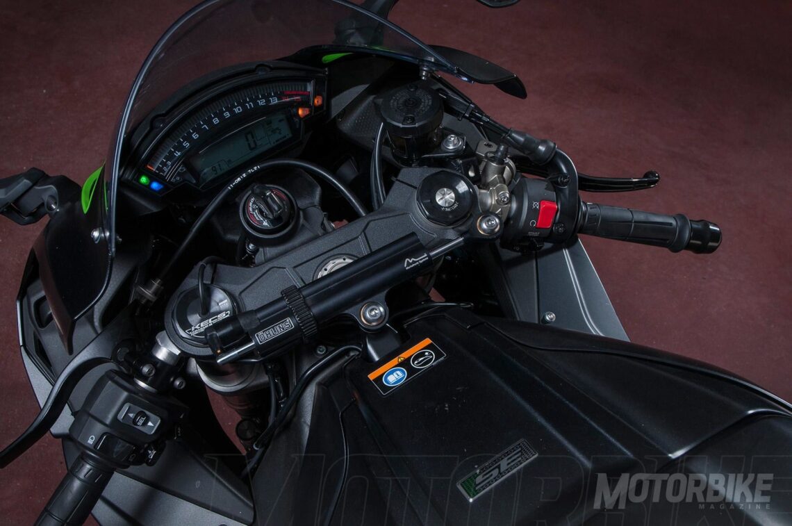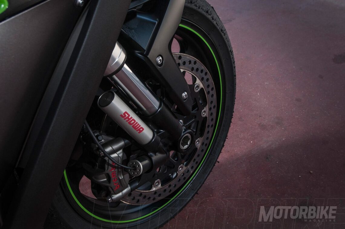Las suspensiones semi-activas, denominadas KECS (Kawasaki Electronic Control Suspension), vienen acompañadas de una unidad ECU independiente, que trabaja en conjunto con la unidad inercial y la centralita estándar de la ZX para procesar no sólo la información de los sensores de las barras y el muelle trasero, sino la inclinación de la moto, aceleración, velocidad, etc. Todo ello se procesa en cuestión de milisegundos para ajustar “en vivo y en directo” la suspensión. Además, el sistema detecta también el modo de conducción que tengamos seleccionado (carretera, circuito o manual) para actuar en consecuencia, ajustándose en el modo ‘road’ para una conducción más suave, en el modo ‘track’ de forma más firme para circuito, y dejando de manos del usuario el ajuste en el modo manual, pudiendo llegar a ajustar desde el panel de instrumentos la compresión o rebote de la suspensión en 15 pasos cada uno. Ah, y no nos olvidemos del amortiguador de dirección, firmado en este caso por Öhlins y que incluye también ajuste electrónico.