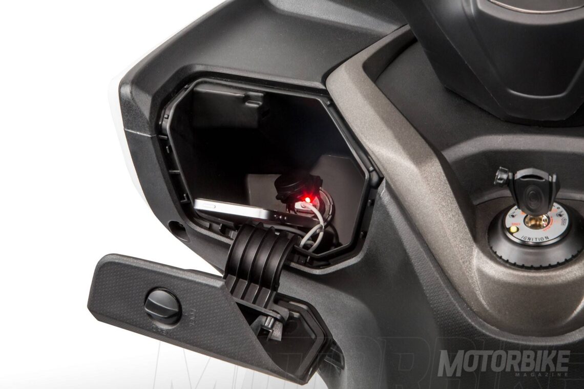 Cuenta con una práctica guantera delantera con puerto USB y en la que cabe sin problemas cualquier Smartphone del mercado, incluso los más grandes. El cuadro de instrumentos tiene mucha información, como la temperatura ambiente, la carga de batería y la capacidad de combustible, entre otros. El depósito tiene una capacidad de 13 litros y está situado bajo la plataforma lo que ayuda también a bajar el centro de gravedad del scooter.