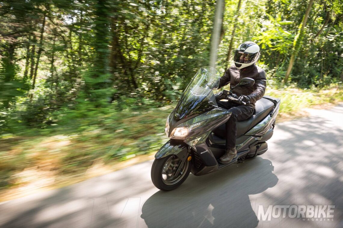 Una vez en carretera, notamos su agilidad en los cambios de dirección, acentuados por los nuevos neumáticos, y con una cúpula lo suficiente grande para desviar el aire y una carrocería que protege bien la zona de las piernas. Las suspensiones cumplen sobradamente su función, con un tarado de serie muy blando para mi gusto, pero que es fácilmente solucionable gracias a los cinco puntos de precarga de los amortiguadores y que son muy sencillos de regular. Los frenos son potentes, permitiéndote detener la moto en pocos metros, y a pesar de ponerlos en apuro en más de una ocasión, no logré que saltara el ABS en ningún momento. En carretera llega con facilidad a los 130 km/h, lo que permite lleves una velocidad adecuada incluso en conducción con pasajero.