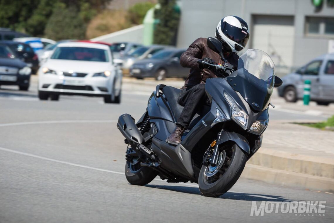Para ver como iba el nuevo modelo de Kymco, la marca nos preparó una ruta por los alrededores de Mataró, con carreteras de montaña con muchas curvas en las que poder ver las características dinámicas del modelo 300. Nada más ponerte a los mandos notas que el asiento es muy cómodo, aunque un poco ancho en la punta, pero con una postura de conducción para nada forzada. Si lo comparamos con el Super Dink, modelo al que quiere sustituir y del que por cierto, soy propietario, la ergonomía era más cómoda en este modelo que en el mío, permitiéndome ir a gusto incluso con la posición de los pies en las plataformas elevadas. La ausencia de vibraciones y un tacto suave del motor hacen que sea muy agradable circular con él, lo que unido a un sonido muy bajo de su escape, le hace ideal para los tramos urbanos. Ahí es donde muestra su mayor potencial, ya que es muy fácil circular con él entre los coches y te permite salir el primero de los semáforos gracias a su gran aceleración.