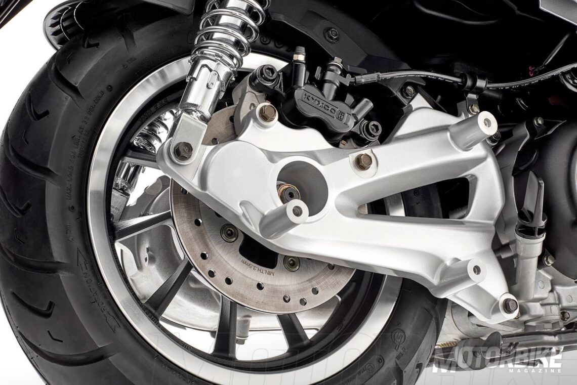 Motor. Es lo que más destaca sin ninguna duda, ya que se ha diseñado desde cero y pensando en todo momento poder superar la próxima normativa Euro 5, en el que llevan trabajando desde hace 4 años. Este nuevo motor, denominado ‘ACC1’ consigue una potencia de 2 cv más que la anterior generación de motores de 125 cc y un menor sonido en su funcionamiento, además de aumentar el par y reducir el consumo. Para ello se han usado componentes más ligeros en la culata y se ha dado un mejor uso de los rodamientos en los balancines que reducen las vibraciones y le da al motor un sonido completamente distinto.