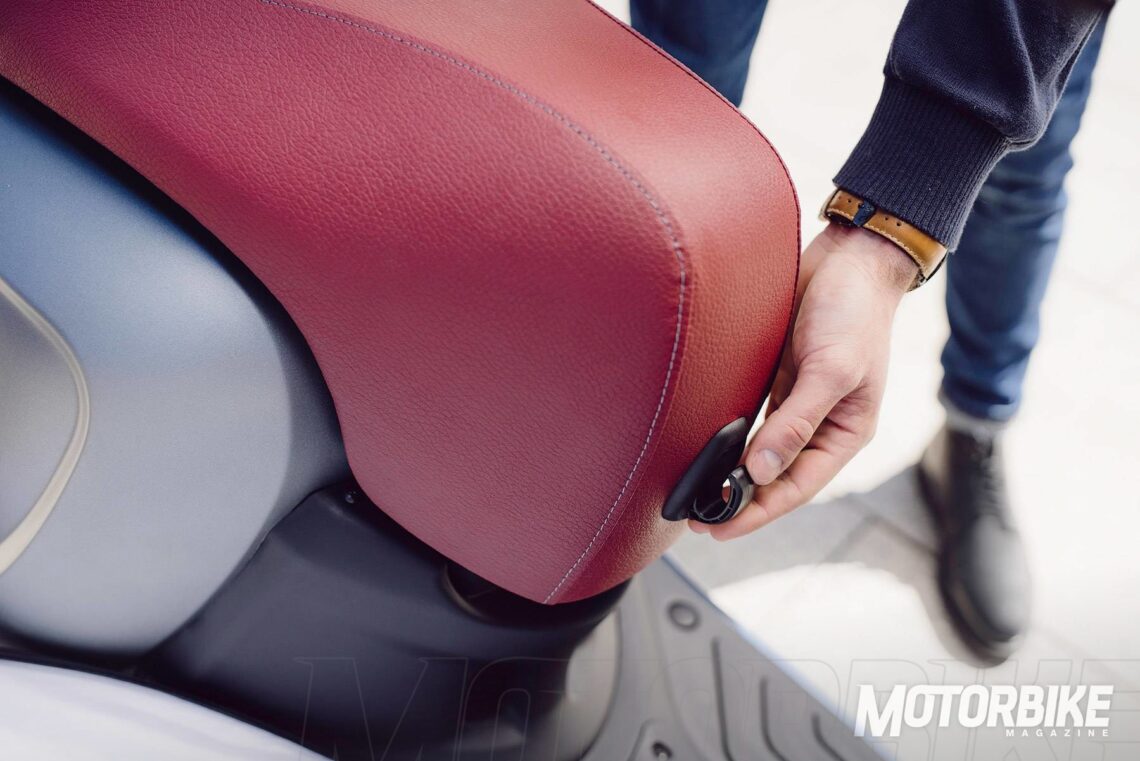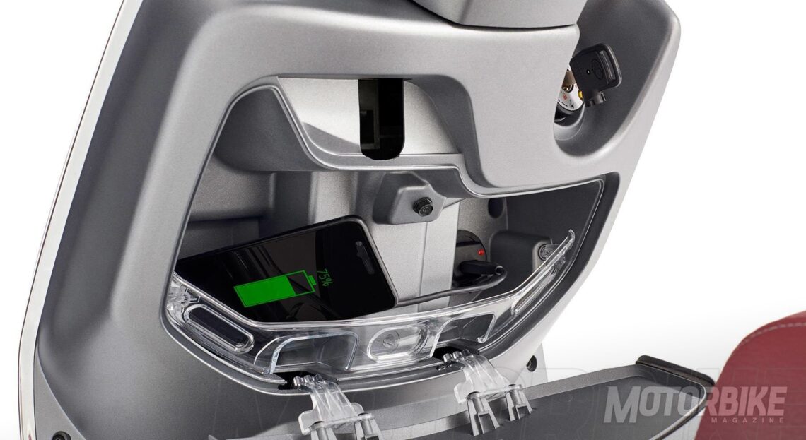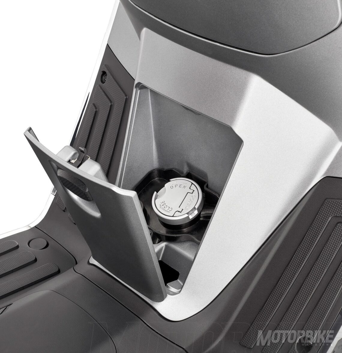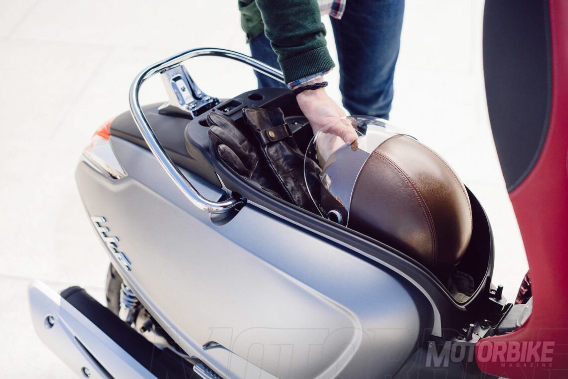 Capacidad de carga. Bajo el asiento encontramos un cofre de diseño cuadrado en el que cabe un casco de tipo jet. Cuenta también con una pequeña guantera de apertura manual con toma USB, que se bloquea automáticamente cuando bloqueamos el manillar de la moto.