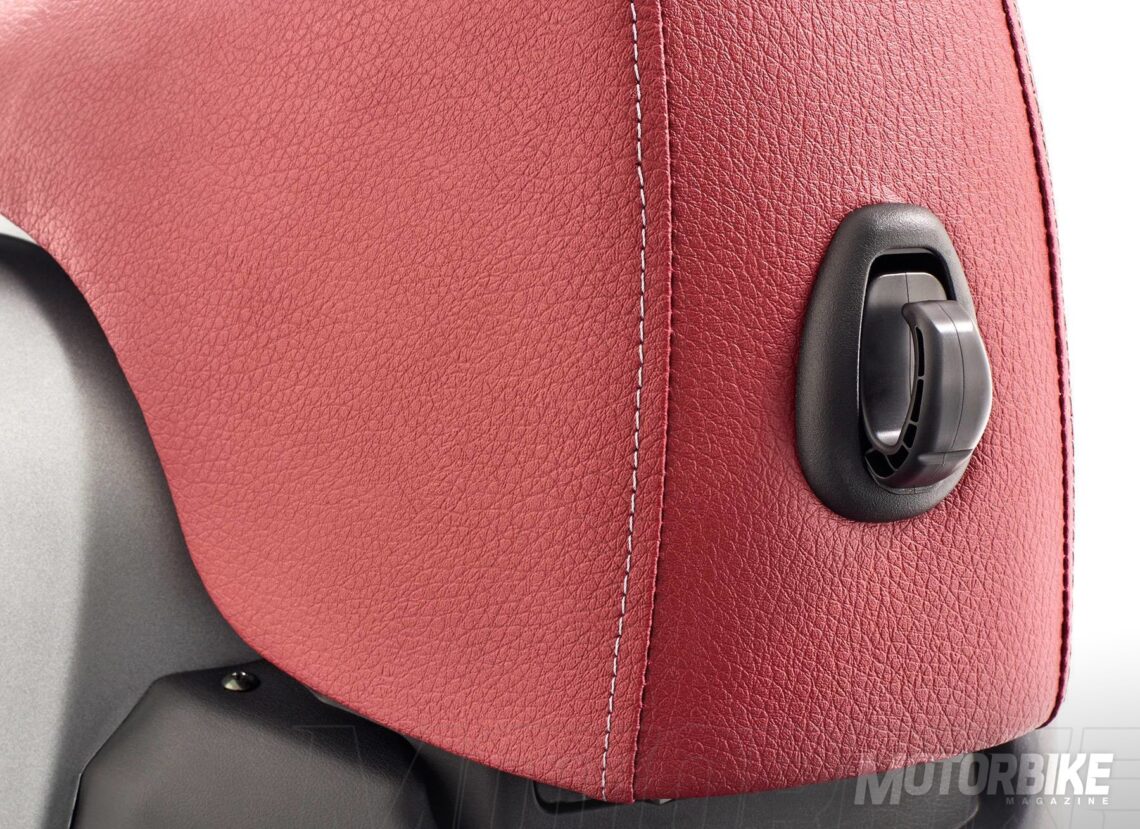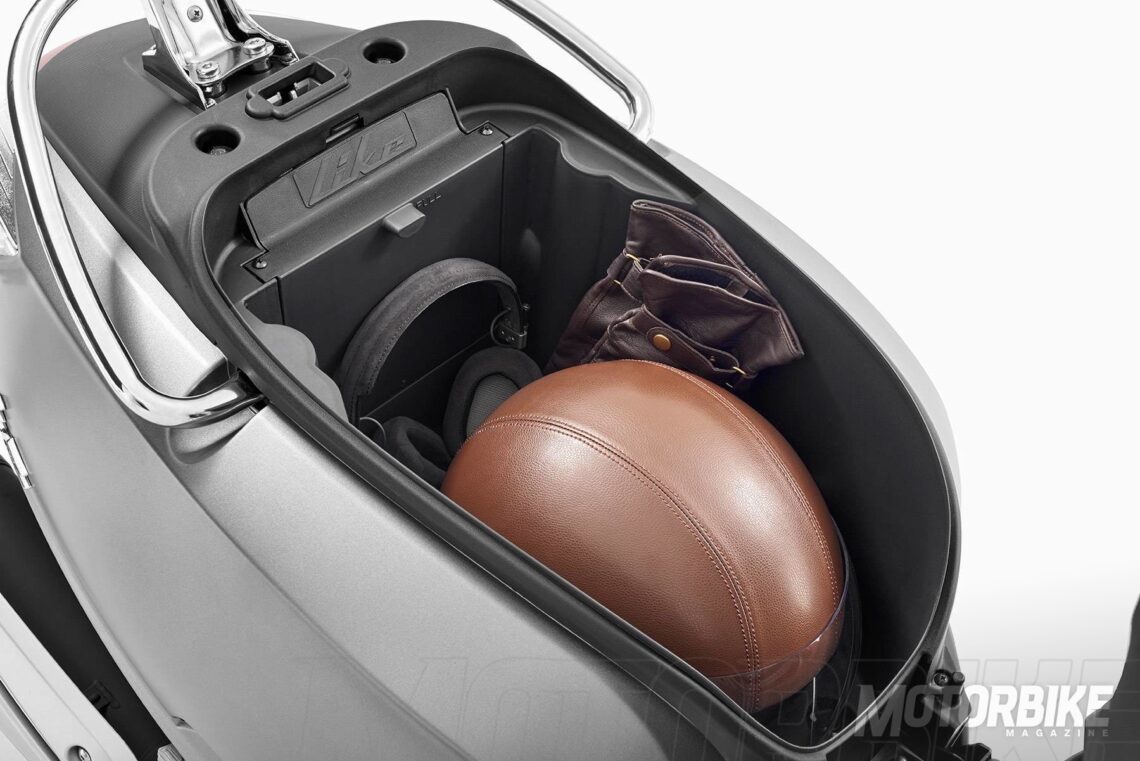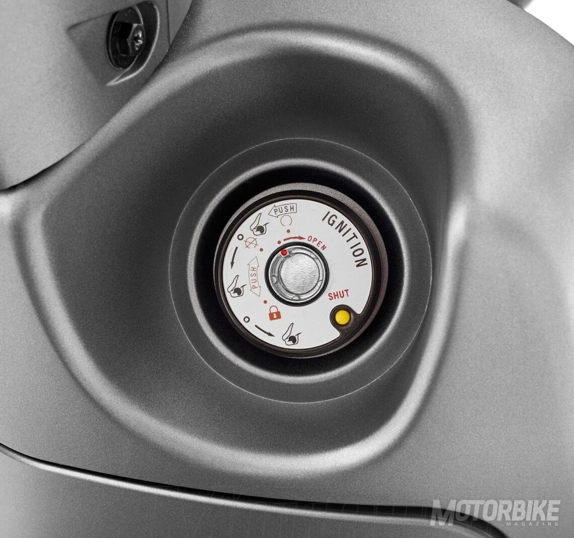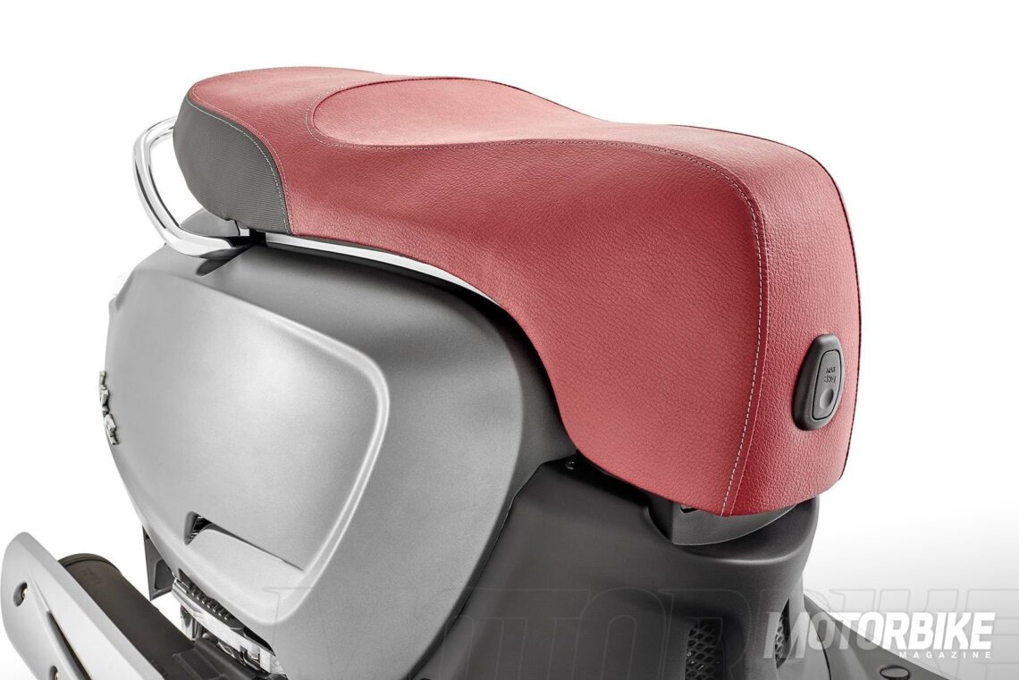 Capacidad de carga. Bajo el asiento encontramos un cofre de diseño cuadrado en el que cabe un casco de tipo jet. Cuenta también con una pequeña guantera de apertura manual con toma USB, que se bloquea automáticamente cuando bloqueamos el manillar de la moto.