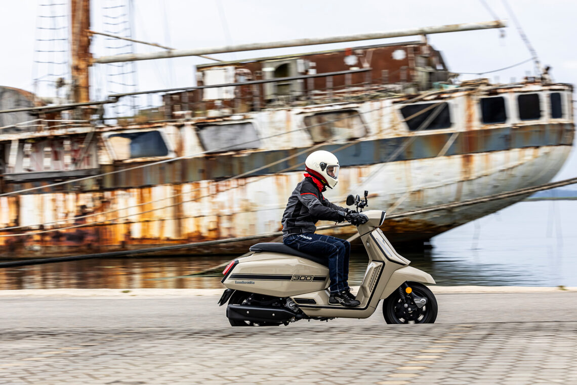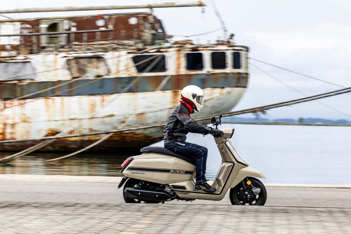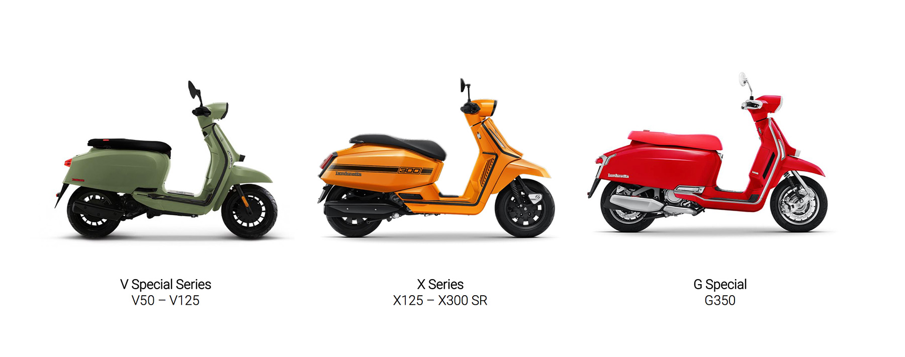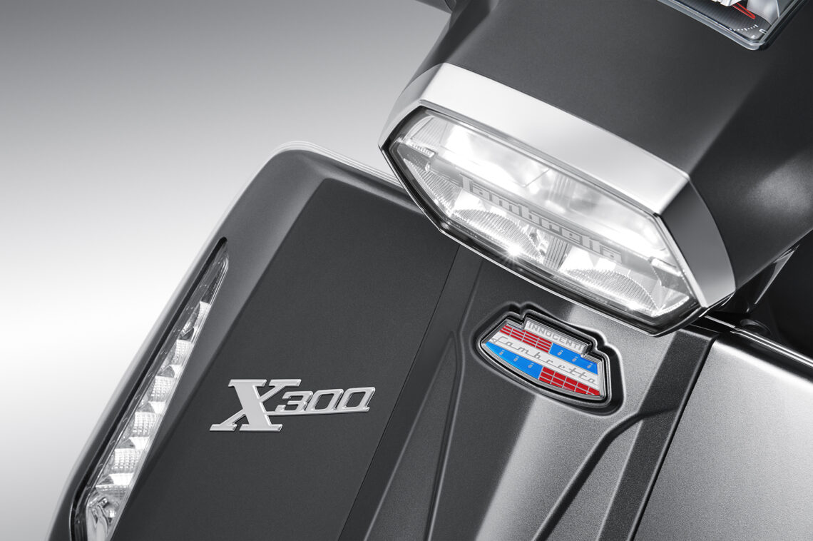 Por un lado, la Lambretta X300, de la serie X, un scooter con un enfoque más deportivo aunque con aire "setentero", compacto y ligero, con motor de 275 cc y una potencia de 25 cv, por supuesto con transmisión automática por variador, y refrigerado por agua. Una de las principales soluciones tecnológicas de este scooter es su famoso chasis mono casco de acero estampado de 1,2 mm de grosor, con un diseño de paneles laterales lo que facilita el acceso al motor por la parte superior (quitando el guarda bultos del asiento) y además le dota de un peso muy contenido. Con ello la altura del asiento al suelo queda en unos 790 mm.