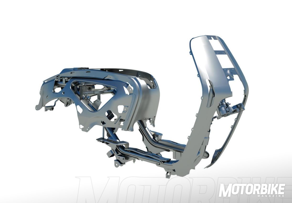 El chasis es un diseño de doble capa de acero, con refuerzos hacia una sencilla cuna inferior que se unifica en un único mástil central.