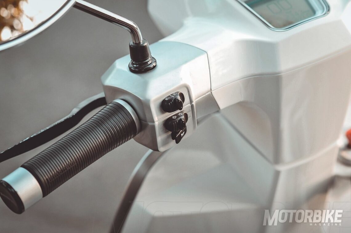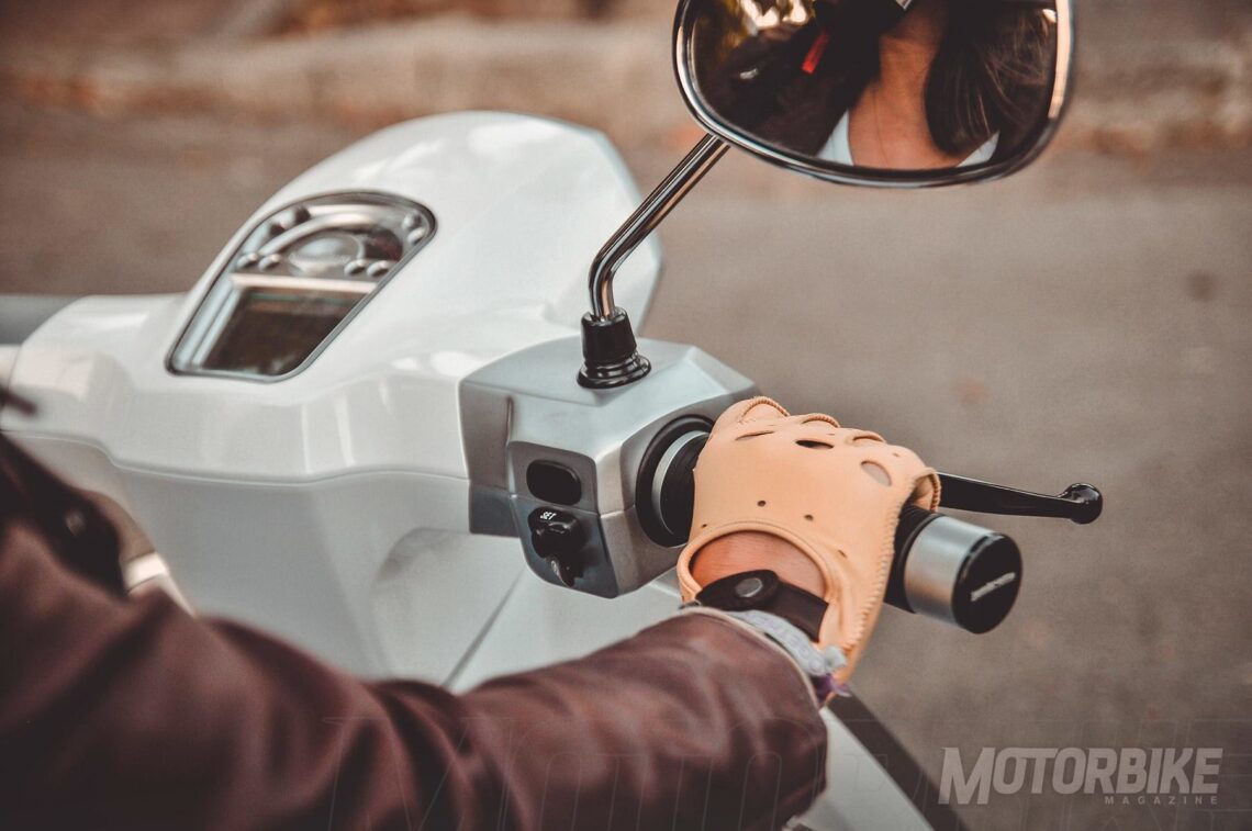 Nuestra Lambretta V125 Special 2019 de prensa viene con la combinación blanco base y adhesivos granates, así como el asiento y los detalles. La primera impresión que nos transmite es lo bajita que es y lo fácil que se mueve de un lado a otro. Esta scooter de 125 pesa muy poco, y el poco peso que tiene va concentrado en la parte inferior del chasis. Incluso la parte frontal se puede mover sin mucho esfuerzo. Otro detalle que nos ha llamado la atención es lo grueso de los puños. En estas motos solemos encontrar mandos muy universales incluso pequeños, para facilitar el uso a todo tipo de usuarios, desde expertos y veteranos hasta noveles o gran parte del perfil femenino. Prueba de ello es la escasa altura del asiento al suelo, que facilita llegar con los dos pies sin problema hasta a los usuarios más bajitos.