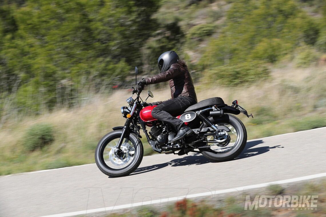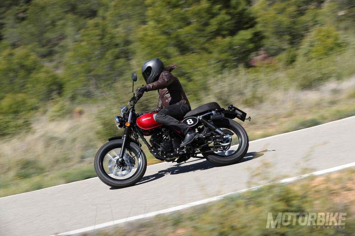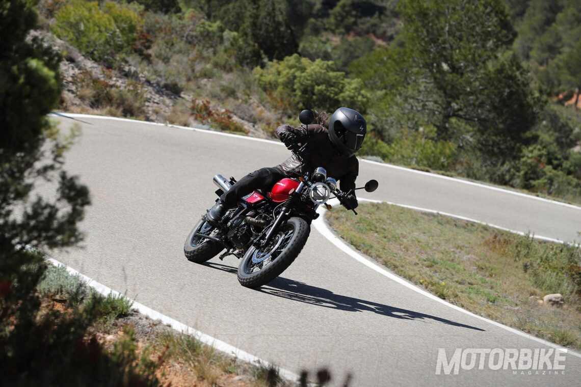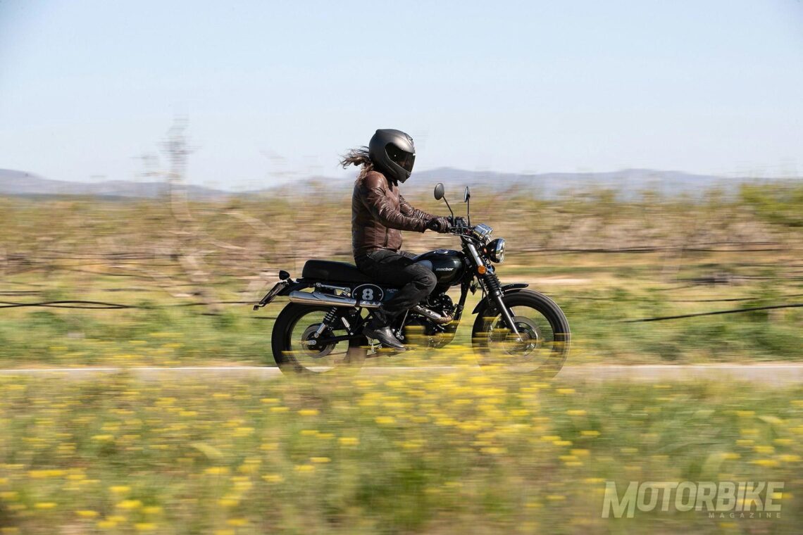A partir de aquí, nos adentramos por carreteras más reviradas donde jugar mucho más con las 5 marchas de la pequeña Macbor Eight Mile 125. Para ser una scrambler 125, nos sorprendió el buen ritmo que puedes conseguir por asfalto (olvidándote de que no llega a 10 cv de potencia) y, además, te das cuenta de que todo funciona a las mil maravillas, con un tacto de frenos, embrague y cambio suave y directo. En este ir y venir de curvas más rápidas o más lentas, me gustaría destacar el buen comportamiento de la suspensión y, sobre todo, de los neumáticos CST. Normalmente no suelen ser santo de mi devoción después de haber probado esta firma en otros modelos, pero este ejemplar mixto cumplió por encima de mis expectativas en asfalto consiguiendo inclinaciones realmente sorprendentes para el tipo de moto del que estamos hablando.