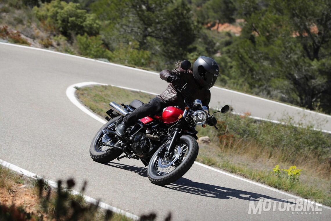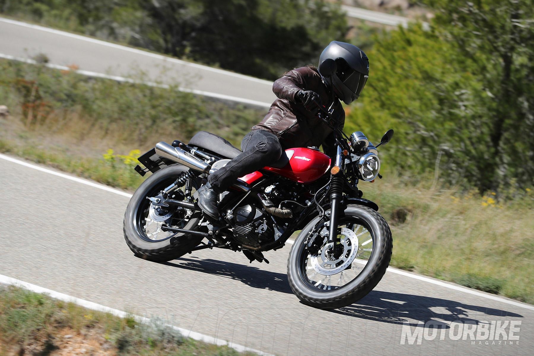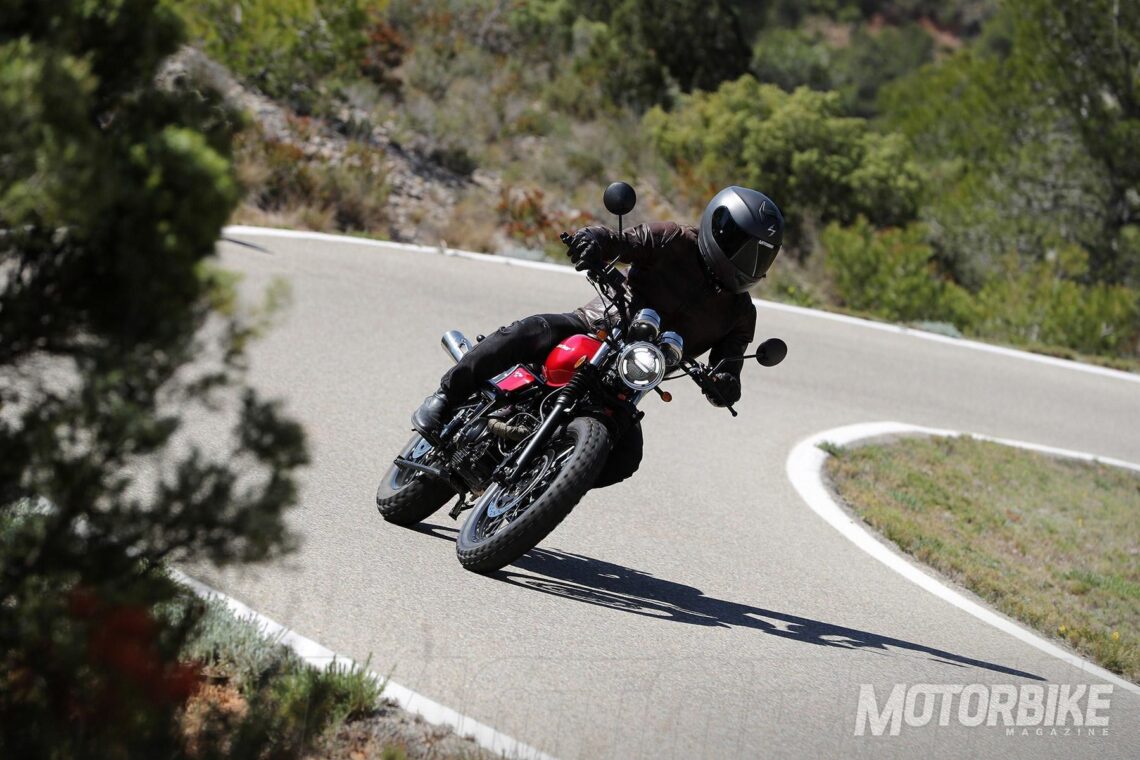 A partir de aquí, nos adentramos por carreteras más reviradas donde jugar mucho más con las 5 marchas de la pequeña Macbor Eight Mile 125. Para ser una scrambler 125, nos sorprendió el buen ritmo que puedes conseguir por asfalto (olvidándote de que no llega a 10 cv de potencia) y, además, te das cuenta de que todo funciona a las mil maravillas, con un tacto de frenos, embrague y cambio suave y directo. En este ir y venir de curvas más rápidas o más lentas, me gustaría destacar el buen comportamiento de la suspensión y, sobre todo, de los neumáticos CST. Normalmente no suelen ser santo de mi devoción después de haber probado esta firma en otros modelos, pero este ejemplar mixto cumplió por encima de mis expectativas en asfalto consiguiendo inclinaciones realmente sorprendentes para el tipo de moto del que estamos hablando.