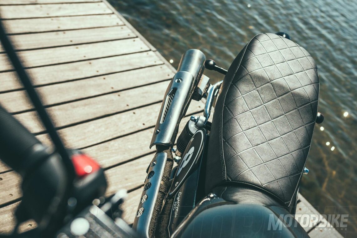 El espectáculo comenzó nada más arrancar la hilera de motos a las que nos subimos los periodistas invitados. El sonido de la Macbor Eight Mile 125 es embriagador ya al ralentí, probando que se puede tener carácter con un run-run agradable y cumplir con las estrictas normas de ruido. En el catálogo, puedes encontrar hasta cuatro opciones de color, con un color negro mate muy serio, un llamativo amarillo, un elegante verde metalizado y un también metalizado color rojo que a la postre se convirtió en mi opción favorita. Sus formas redondeadas modernas saben respetar ciertos detalles clásicos con muy buen gusto. Simpático es el detalle del compartimento que dispone en el lateral izquierdo bajo el asiento al lado de la suspensión para guardar pequeños objetos o el mapa (guiño clásico). Y atención al espectacular acabado del asiento. ¡La verdad es que es muy bonita!