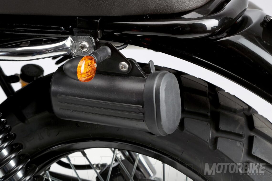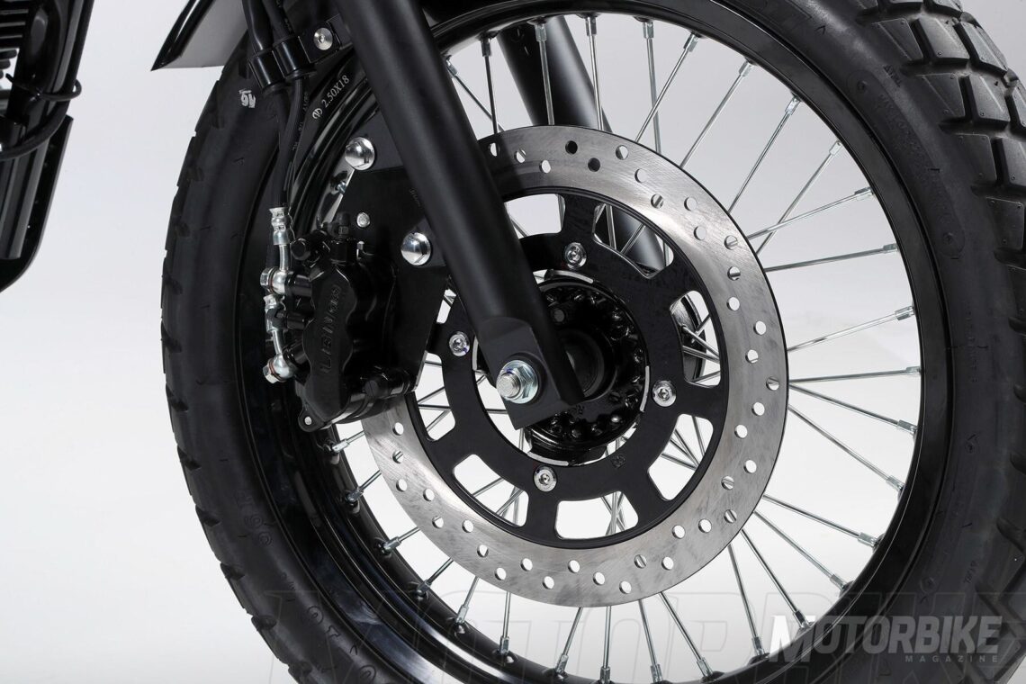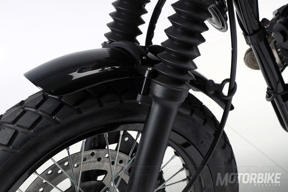 El estilo scrambler de la Macbor Eight Mile 125 es evidente empezando por las ruedas mixtas con llantas de radios, el asiento plano de 820 mm de altura, los fuelles de la horquilla, el mencionado escape elevado o los guardabarros cortos y elevados.
