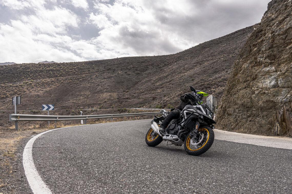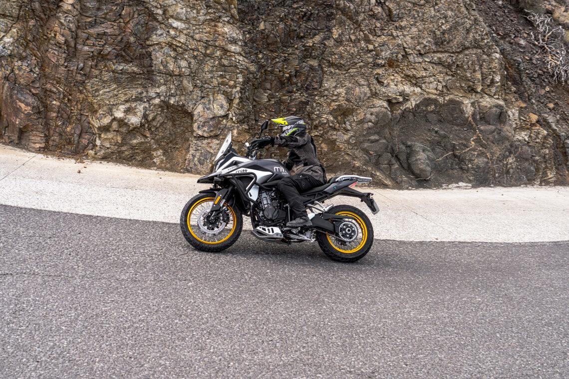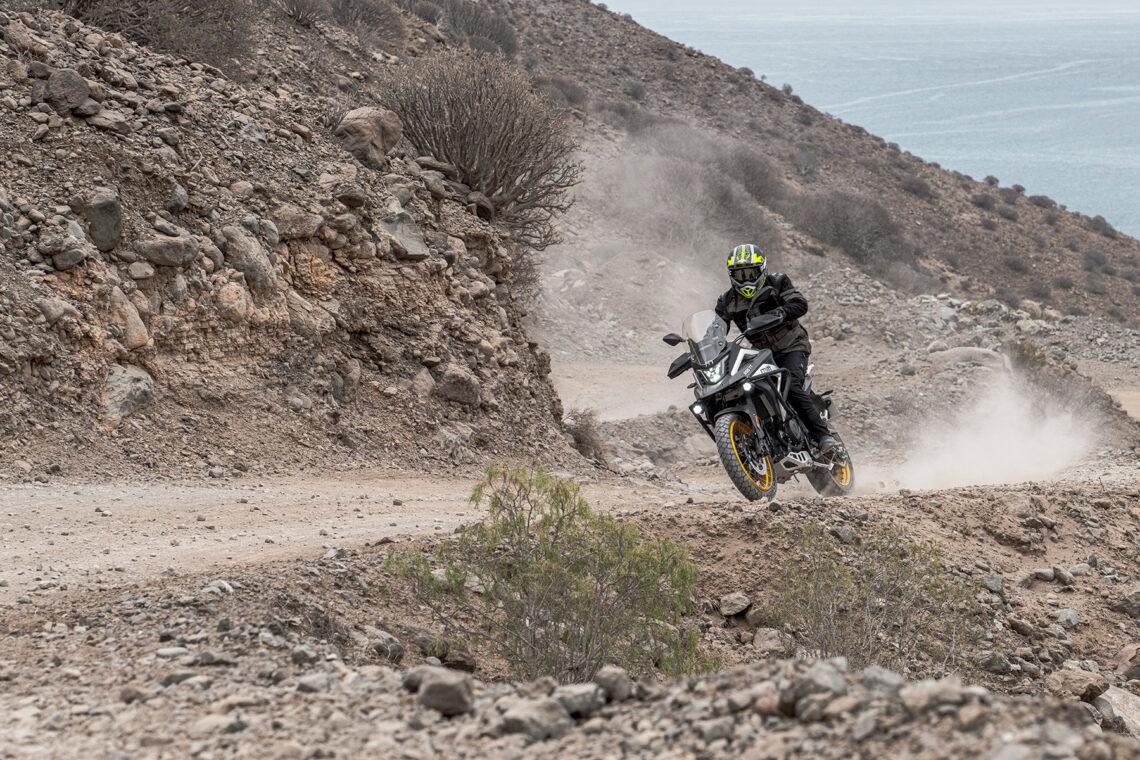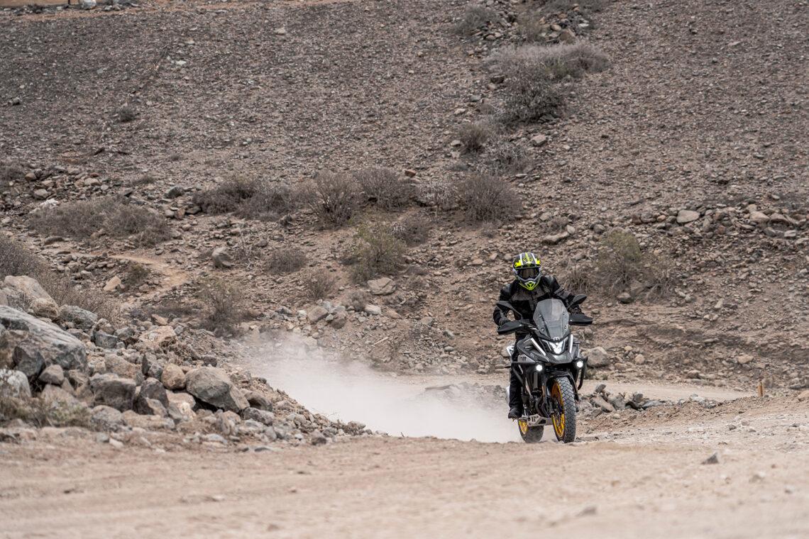 Va bastante sujeta enlazando curvas, aunque cabe destacar que ajustaron la suspensión para las carreteras de Gran Canaria. Una moto escuela a considerar, con el añadido de también poder empezar en off-road. Frena bastante bien, aunque su ABS sea un poco intrusivo. Quizás lo único que le hecho en falta sea una perilla para ajustar la precarga del amortiguador trasero en caso de llevar carga, más aún contando con un conjunto de tres maletas opcionales a un coste muy interesante.