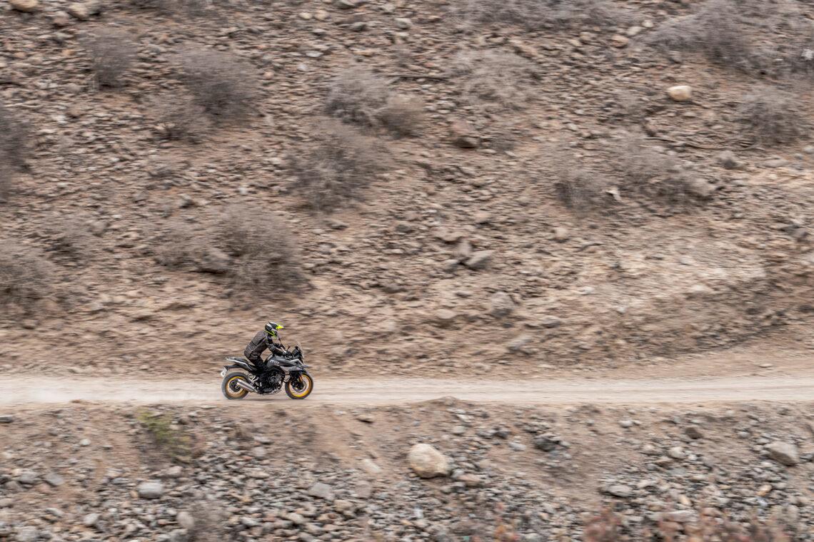 Con ABS desconectable, no pudimos resistirnos a hacer un poco de off-road con ella. La postura de pie es bastante natural, lo suficiente como para tener control sobre la moto. Además, la zona central de la moto da bastante sujeción, pero sus estriberas son de asfalto y no se pueden quitar sus gomas. Quizás yendo más despacio se noten sus más de 200 kg, pero en general transmite agilidad. El tacto de sus frenos en campo es muy bueno y nada brusco, incluso con dos discos delanteros. En general, se desenvuelve decentemente, tanto por la suavidad de su motor como por sus suspensiones regulables o ABS desconectable.