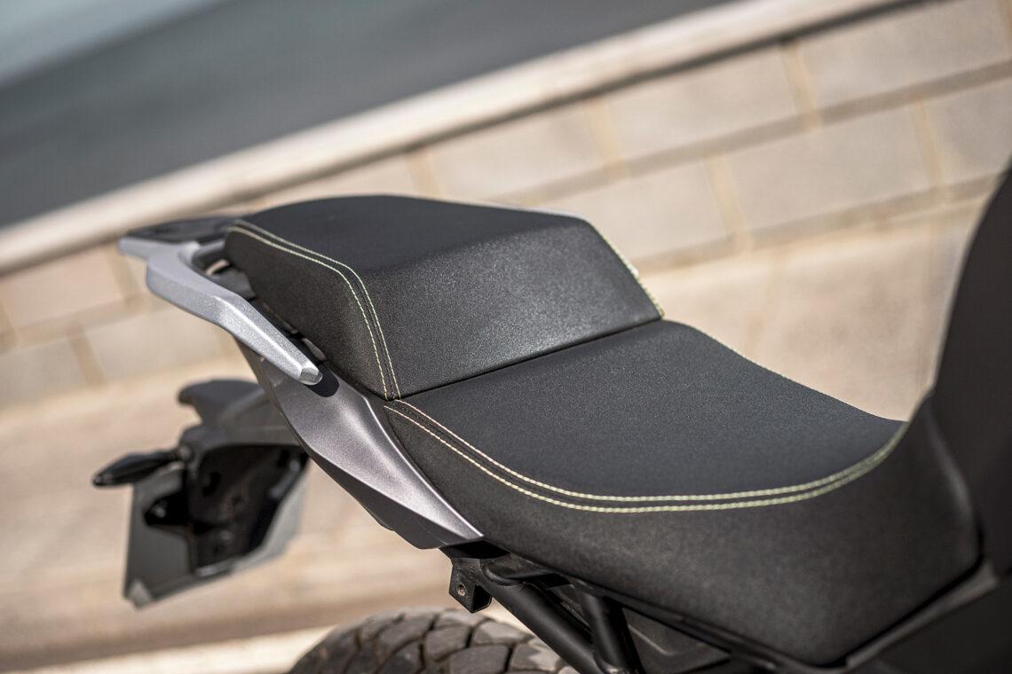 Para ir de menos a más, cabe destacar que su ergonomía es bastante accesible, ya que su asiento se encuentra a 810 mm del suelo. Sin embargo, sus líneas tanto del depósito como del asiento del acompañante hacen que quedes algo encajonado. Una vez arriba, con mi estatura (171 cm) llego con la punta de los dos pies al suelo. Su asiento tiende a ser cuadrado y resulta un poco ancho, mientras que el triángulo ergonómico da como resultado una posición muy erguida, pero sin ir distanciado del suelo.