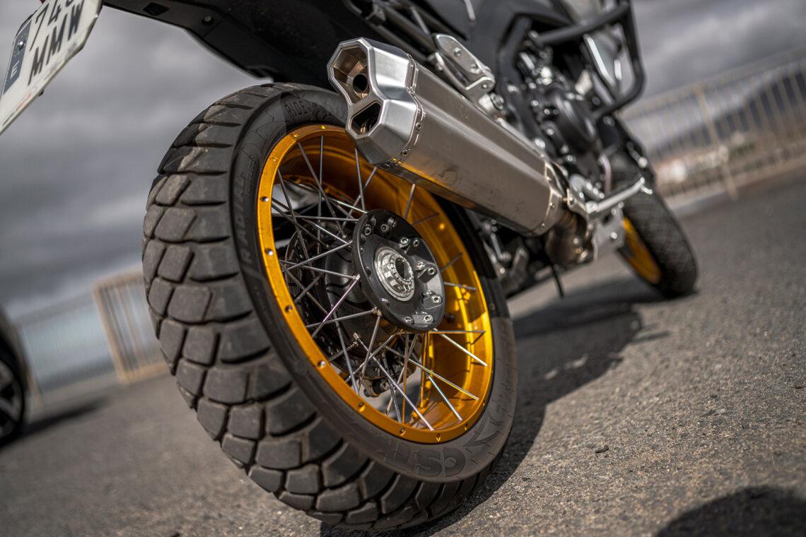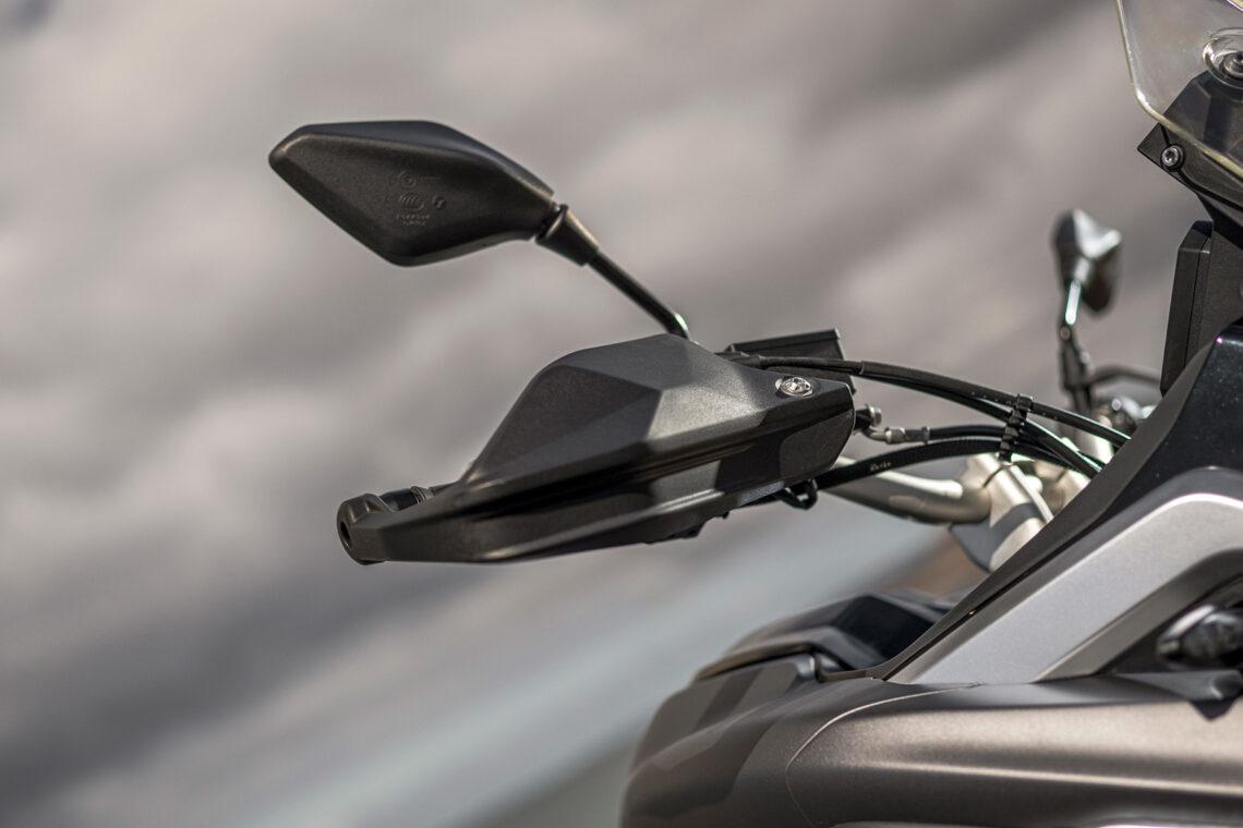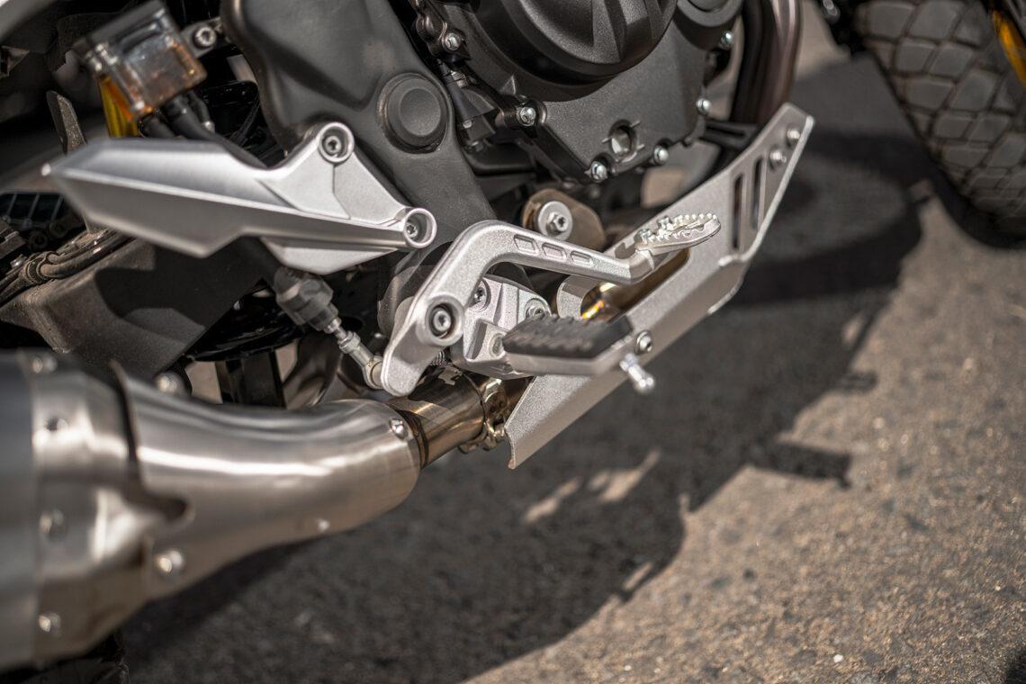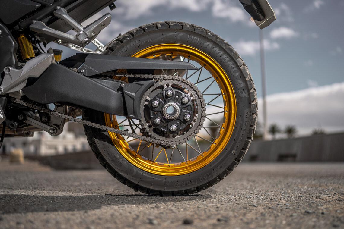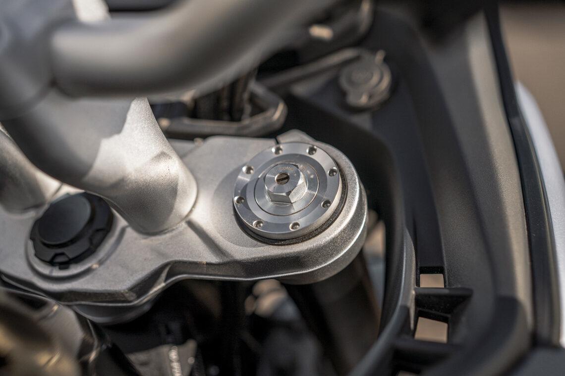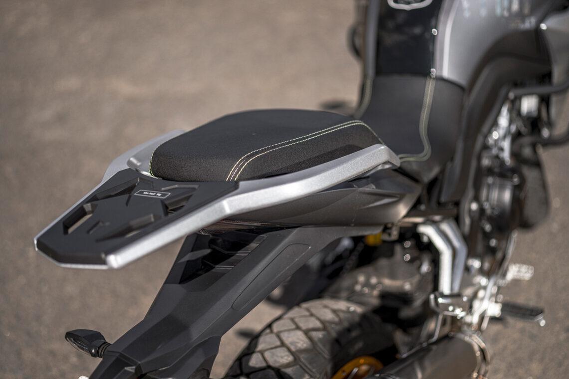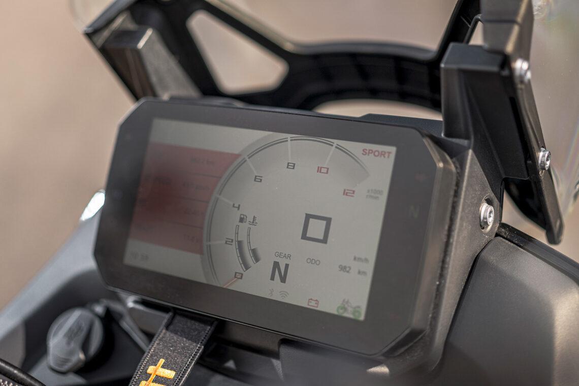 Seguimos sin arrancarla y nos llama la atención varios accesorios de equipamiento que trae de serie: barras de protección, luces auxiliares, tomas USB, USB-C y 12V, protector de radiador, cubremanos, cubrecárter y una completa pantalla de 7’’ con conectividad. También queríamos ver de cerca su basculante monobrazo, además de sus llantas de radios (19'' delante y 17'' detrás) que es lo que va a definir esta moto junto a su peso en marcha de aproximadamente 220 kg.